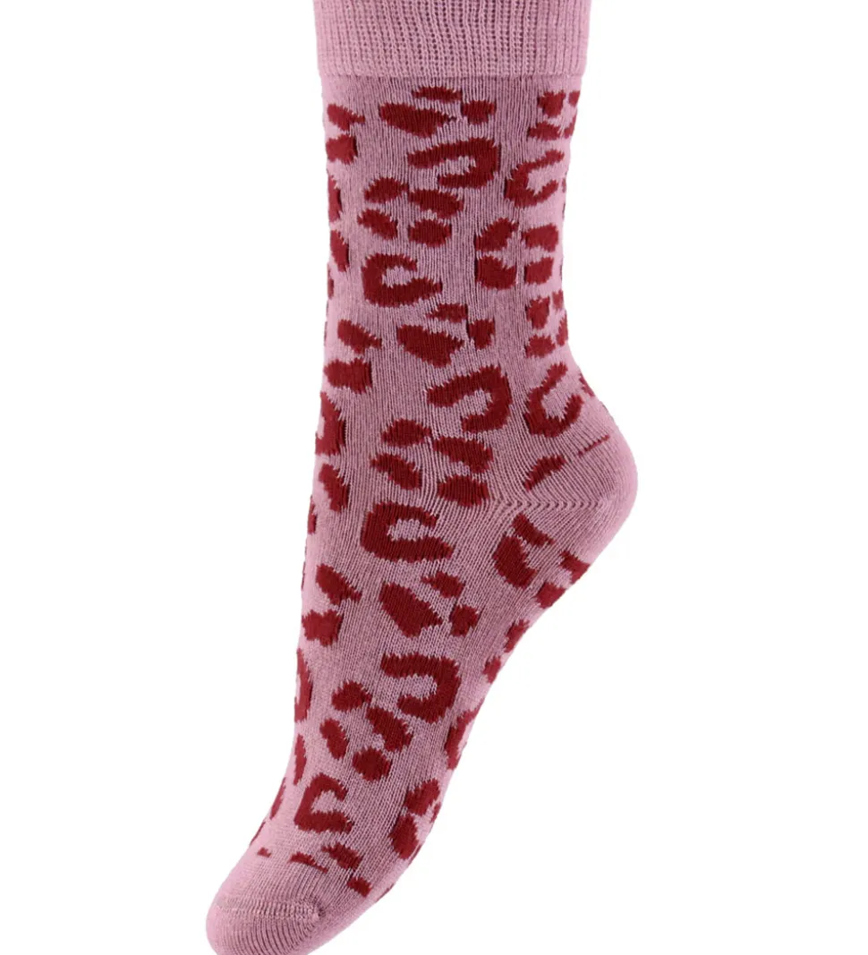 Attraktive MiniPop strømper i en 3-pak med forskellige mønstre. Et par er råhvide med blomster, et er mørk rosa med leopardmønster, og et tredje er råhvide med små hjerter. Strømperne har et langt skaft med en robust ribkant øverst for god pasform.