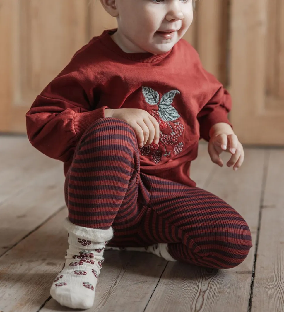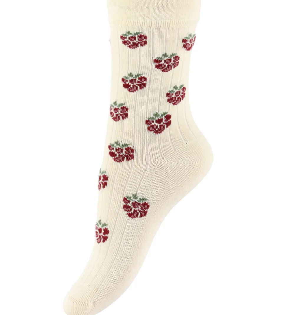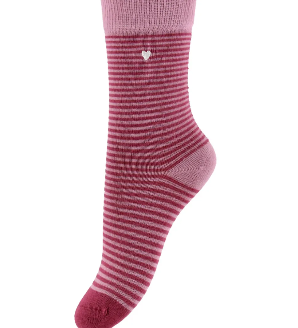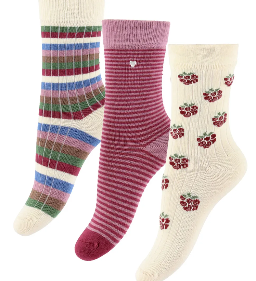 Flotte MiniPop strømper i en 3-pak med forskellige designs. Et par har et farverigt stribet mønster, det andet par er fuchsia med tynde striber og et lille hjerte, og det tredje par er cremefarvet med bærprint. MiniPop strømperne har elastik øverst, som sikrer god pasform.
