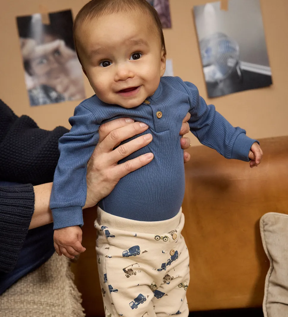 Fin Minymo body i mørkeblå med ribstruktur. Bodyen har en rund halsudskæring med to knapper fortil. Den har lange ærmer med brede ribkanter. Bodyen lukkes med trykknapper mellem benene, og kan justeres i længden, så den kan bruges i længere tid.