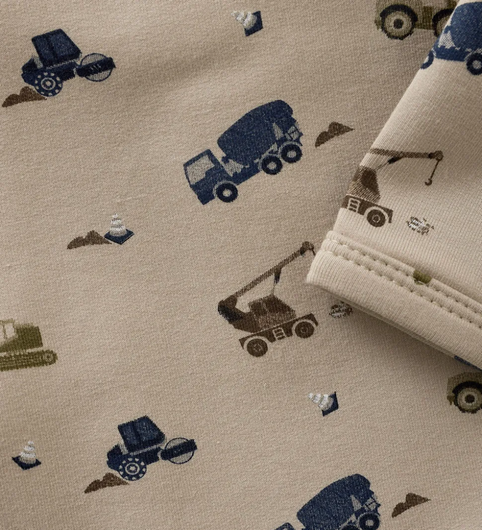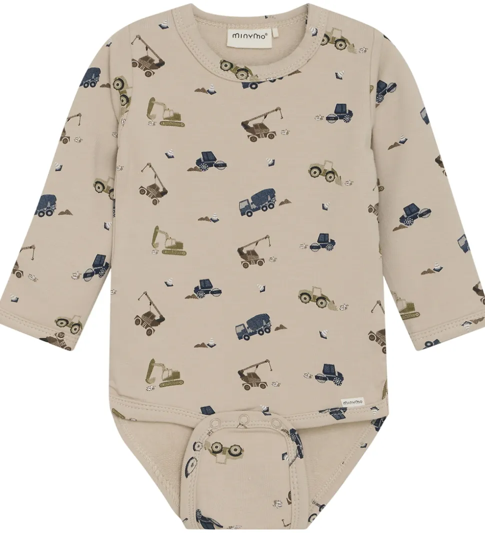 Smart Minymo body i beigefarvet sweat og med et print med forskellige arbejdsmaskiner i blå og brune nuancer. Bodyen har lange ærmer og praktiske trykknapper i bunden, som gør den let at åbne og lukke. Bodyen lukkes med skjulte trykknapper ved begge skuldre.