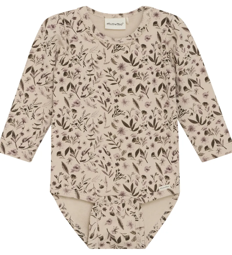 Charmerende Minymo body i lys beige sweat med et delikat blomsterprint i afdæmpede beige og brune nuancer. Bodyen har lange ærmer med fine pufskuldre, og i halsåbningen har den en sød blondekant. Mellem benene er der tre trykknapper, og bodyen lukkes med skjulte trykknapper ved begge skuldre.