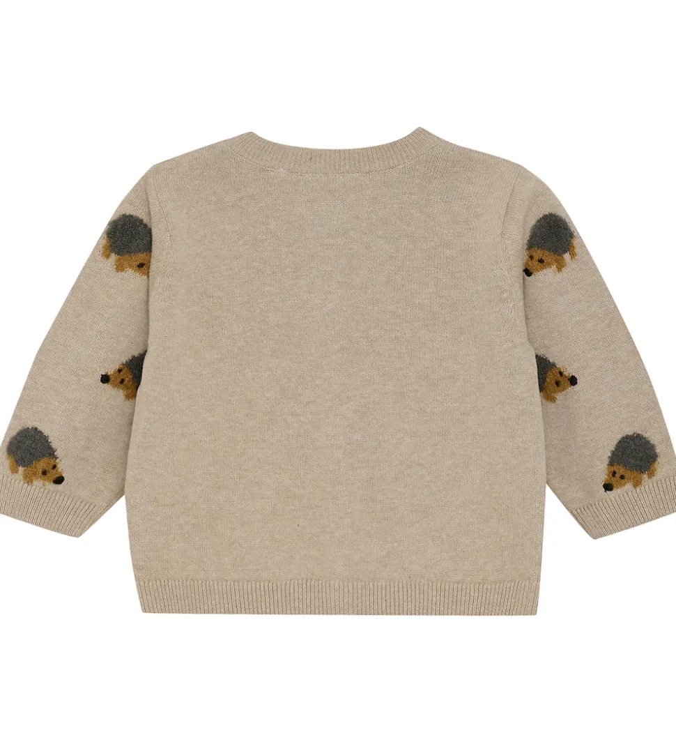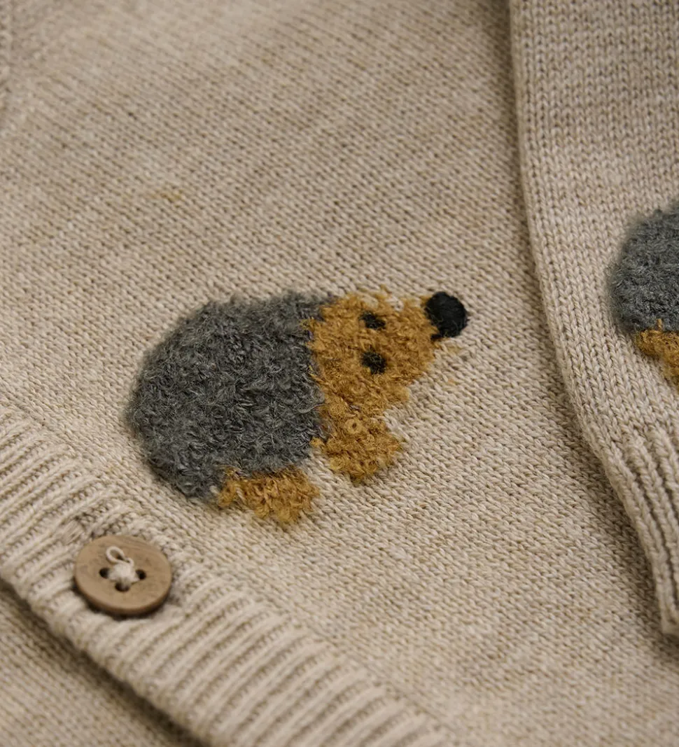 Charmerende Minymo cardigan i en lys beige nuance med lange ærmer. Minymo cardiganen har et fint pindsvinemønster spredt over fronten og ærmerne. Den har en knaplukning foran med praktiske trækknapper.