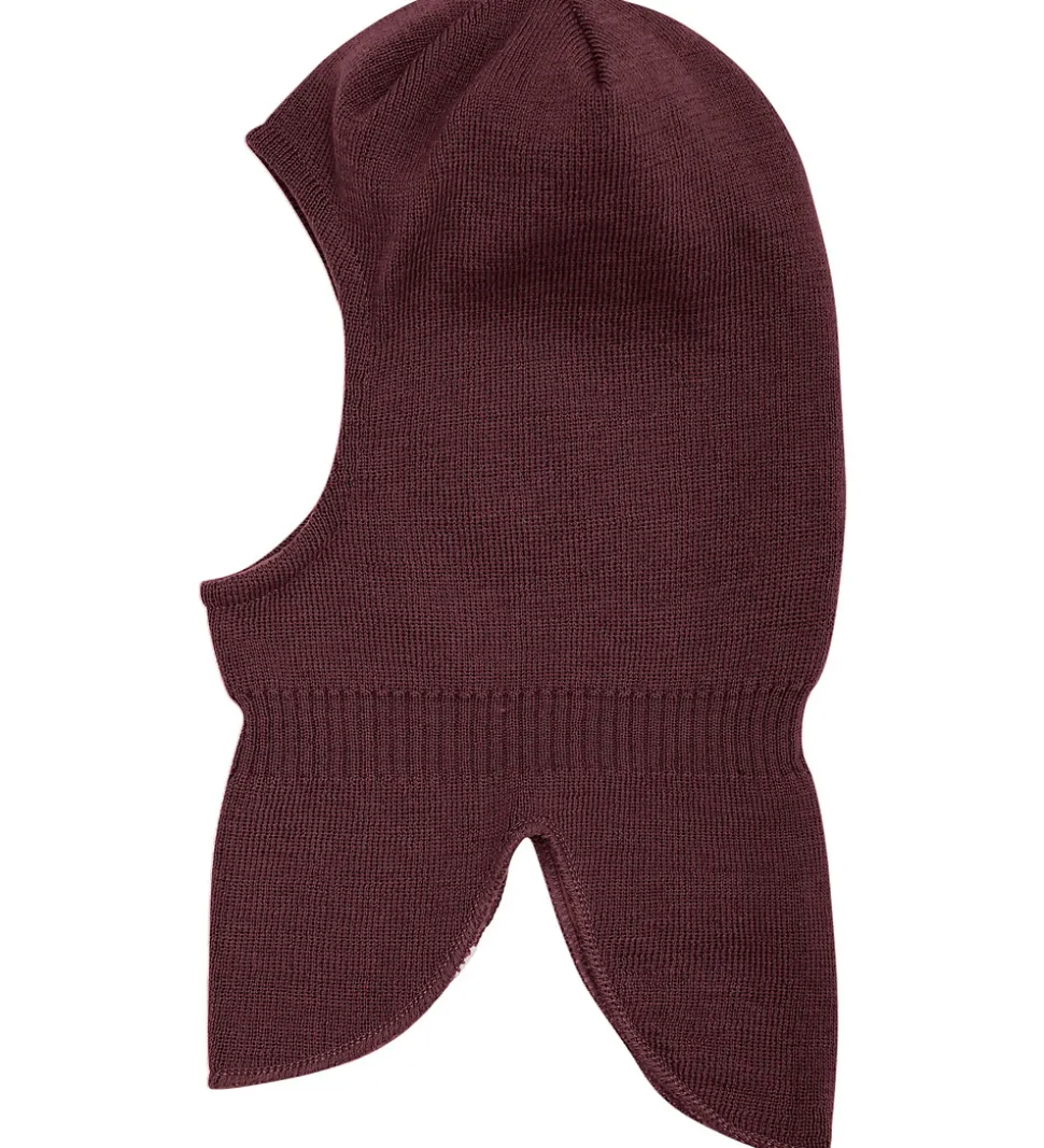 Lækker Minymo elefanthue i mørkelilla strik med en lille, refleks-logoapplikation ved halsen fortil.