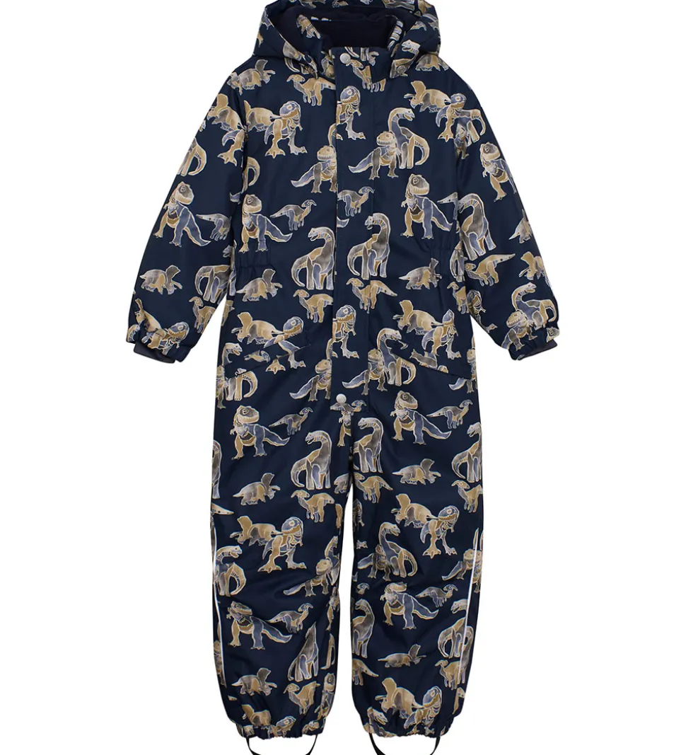 Smart Minymo flyverdragt i mørkeblå med et alloverprint af dinosaurer i blå og grønne nuancer. Flyverdragten har praktiske refleksdetaljer.