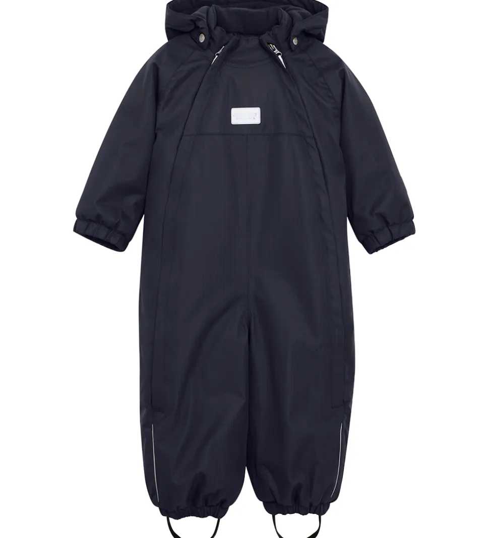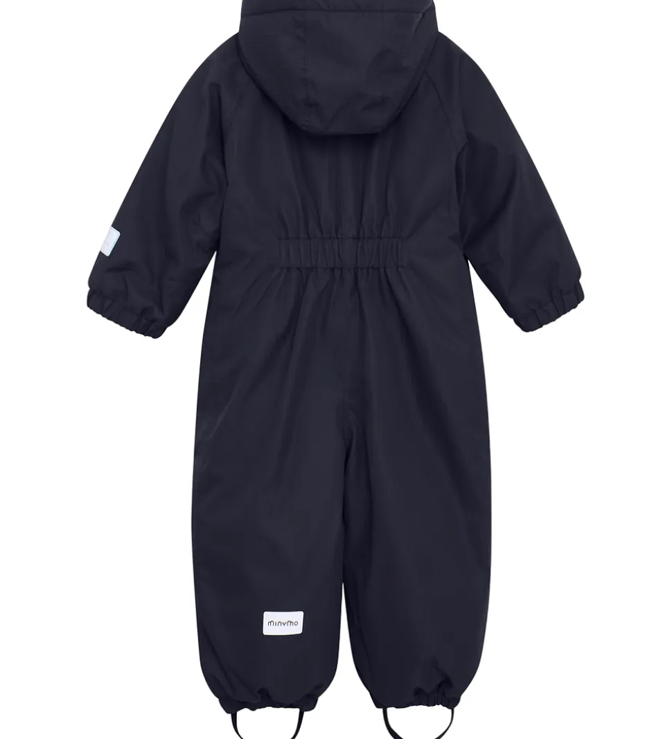 Dejlig Minymo flyverdragt i navyblå med flere velplacerede refleksapplikationer og -detaljer.