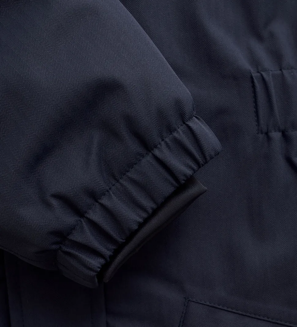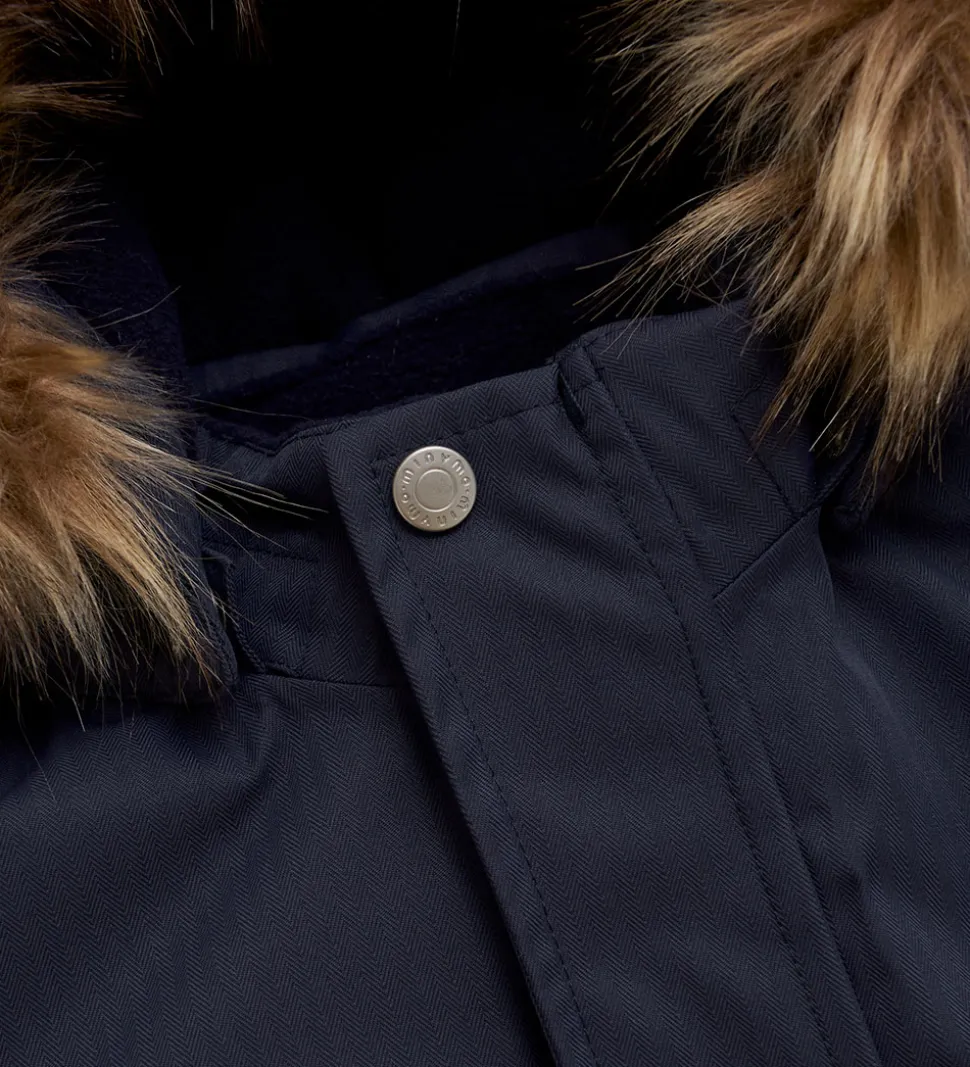 Flot Minymo flyverdragt i mørkeblå med praktiske refleksdetaljer.