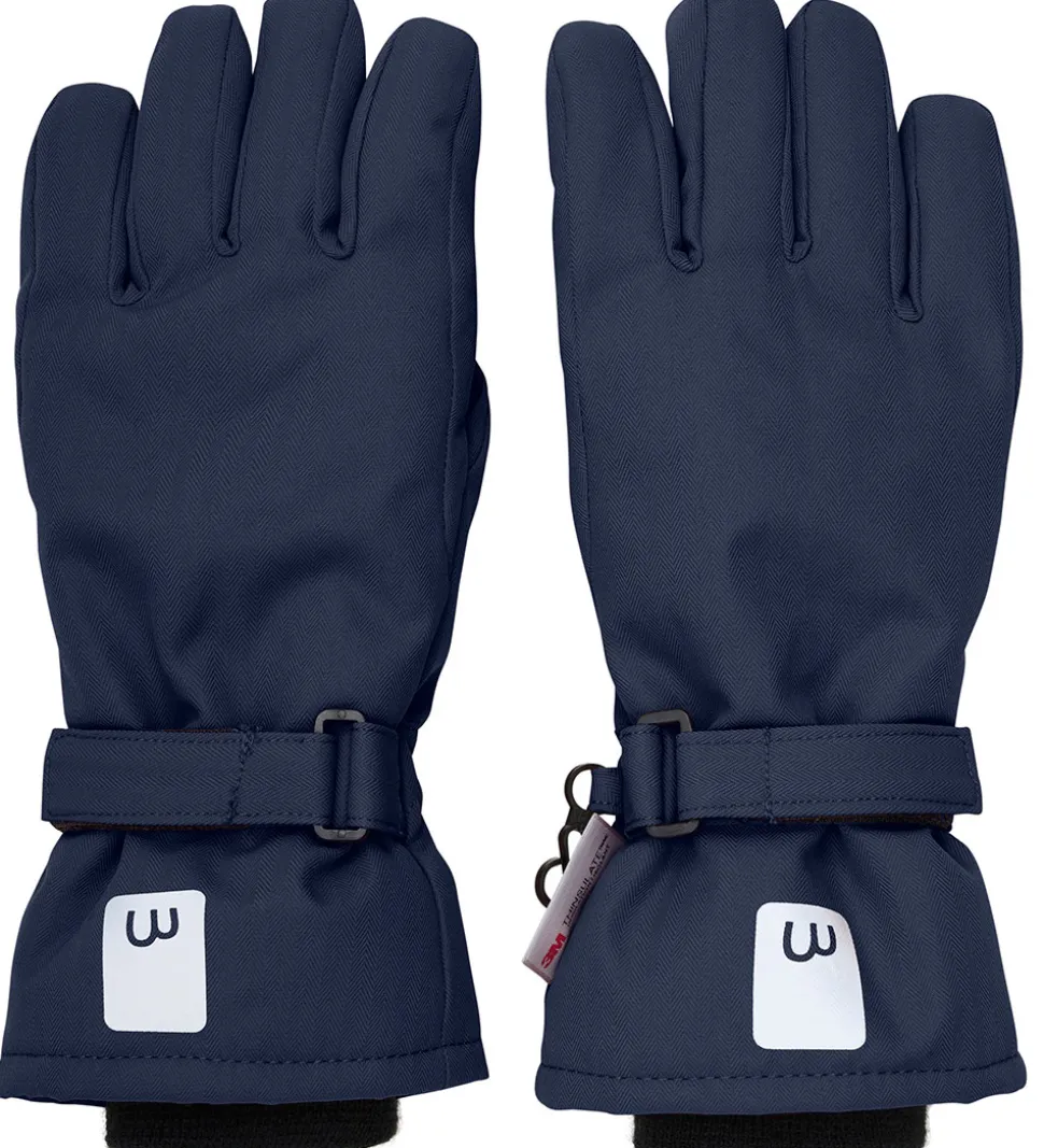 Fine Minymo handsker i navyblå med reflekslogo øverst. Minymo handskerne har snefang i åbningerne med brede ribkanter. De kan justeres ved håndleddene med en velcrorem. Indvendigt er der blødt fleece.