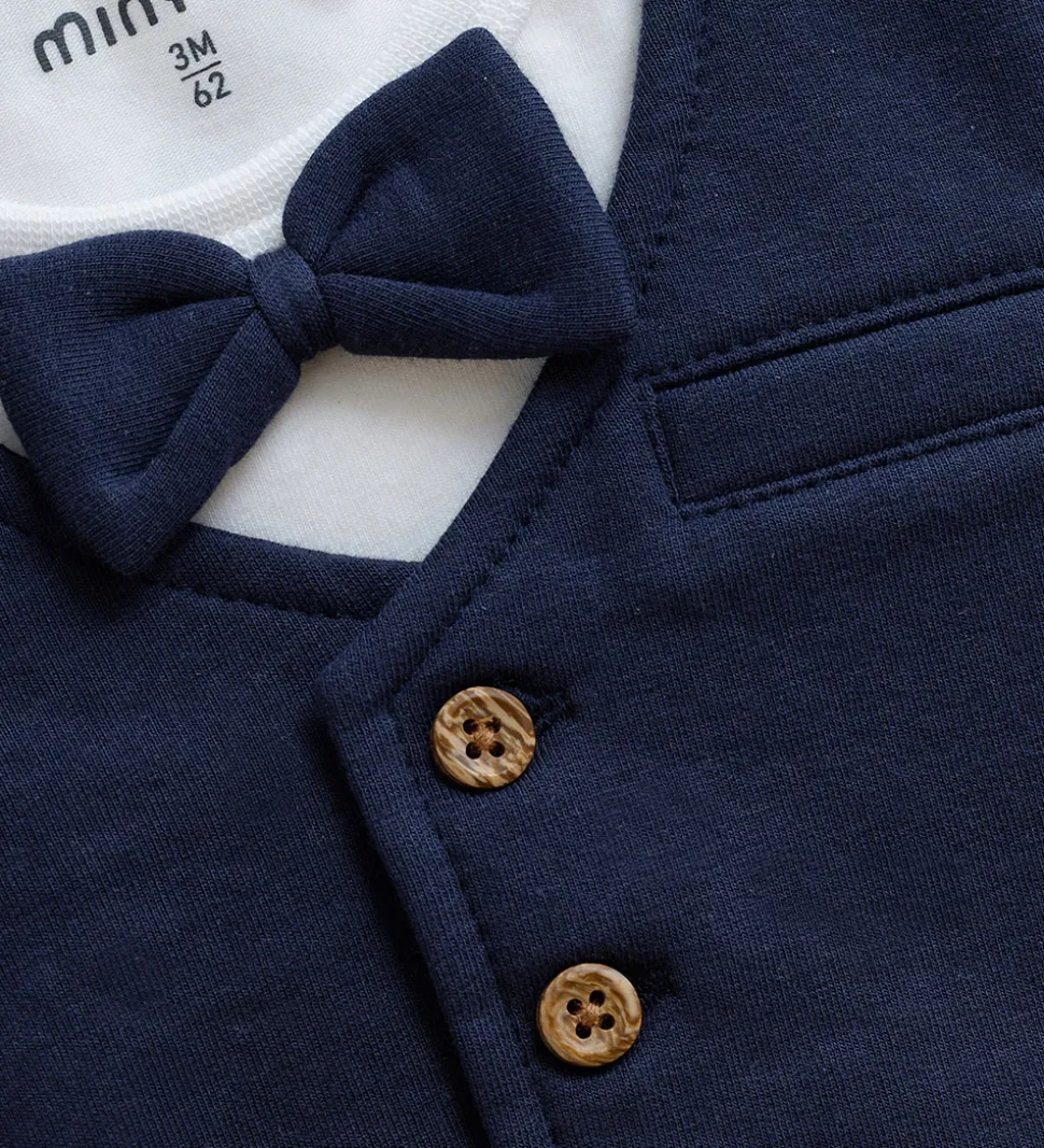 Elegant Minymo heldragt i en kombination af hvid og mørkeblå. Heldragten har et flot design med en integreret vest og butterfly, der giver et stilfuldt udtryk.