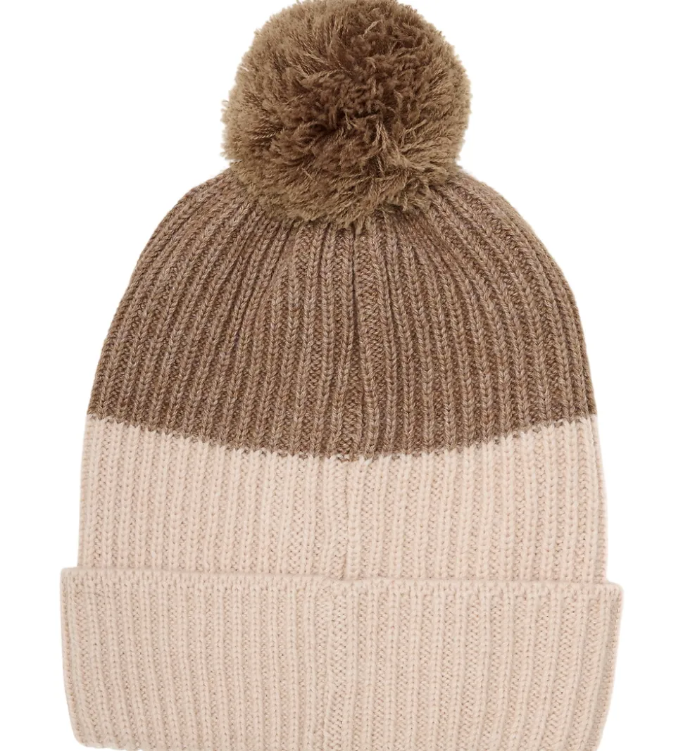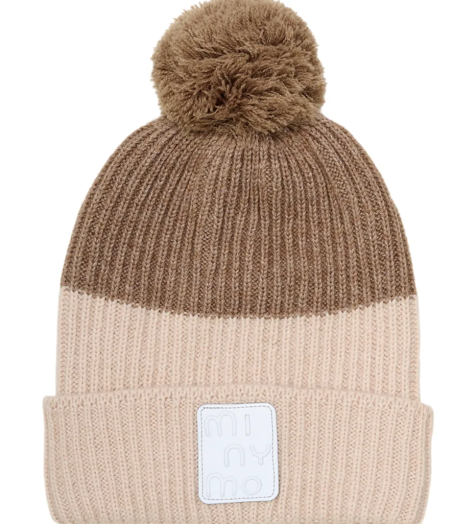 Lækker Minymo hue i beige og brun. Huen er strikket i en flot ribstruktur og har en fin kvast på toppen.
