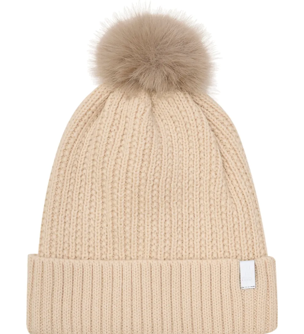 Lækker Minymo hue i lys beige. Huen er strikket i en flot struktur og har en fin, aftagelig kvast på toppen i imiteret pels.