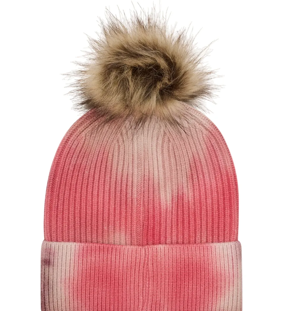Lækker Minymo hue med tie-dye i rosa og lilla nuancer. Huen er i flot ribstrik og med en fin, aftagelig kvast på toppen i imiteret pels.