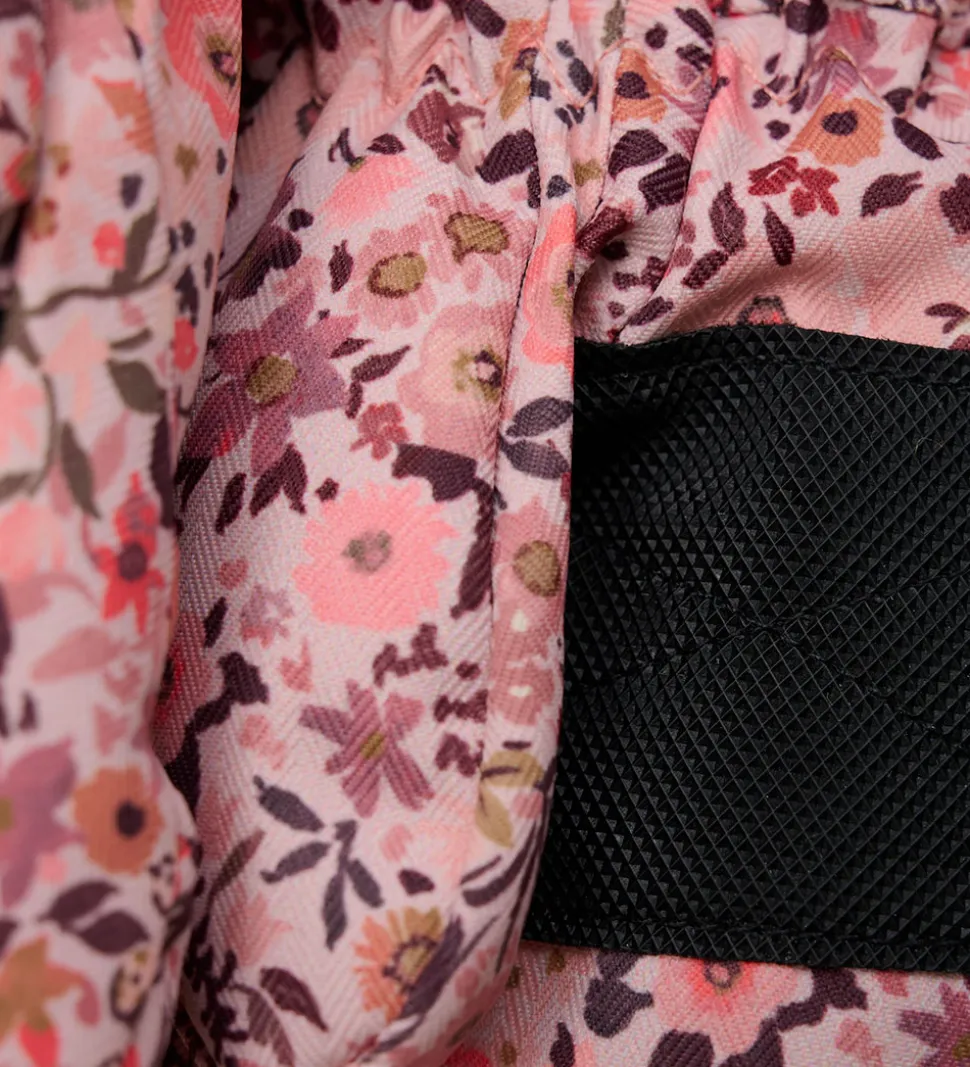 Skønne Minymo luffer i rosa med blomsterprint i rosa, lilla og brune nuancer. Minymo lufferne har elastik i åbningen og en lynlås, som gør det let at få lufferne på. Ved håndleddene kan de strammes ind med en velrorem. Lufferne har blødt fleecefor indvendigt.