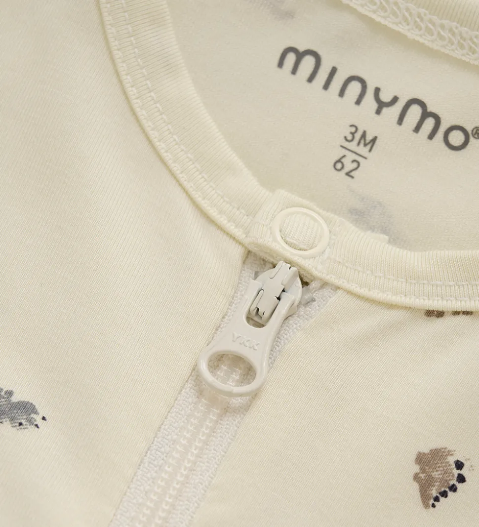 Skøn Minymo heldragt i cremehvid med et fint allover dinosaurerprint i grå, beige og brun.