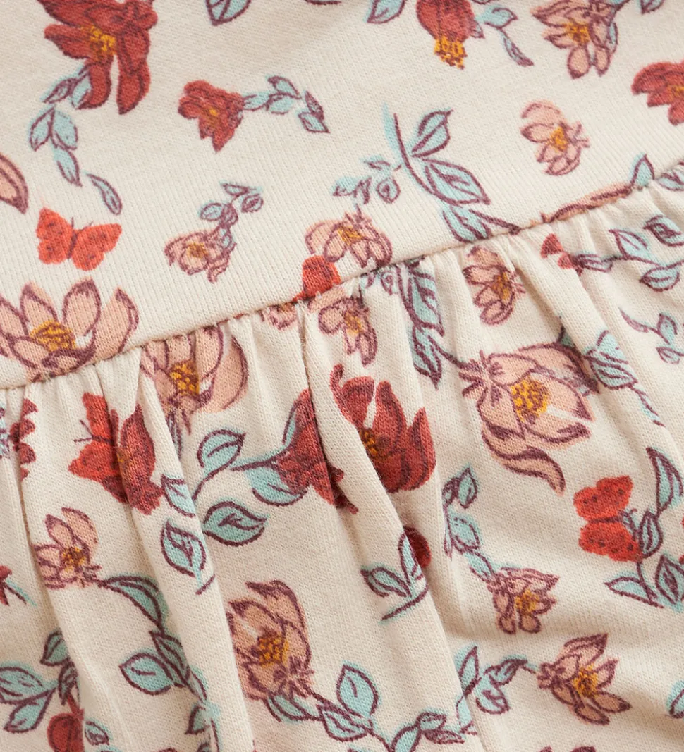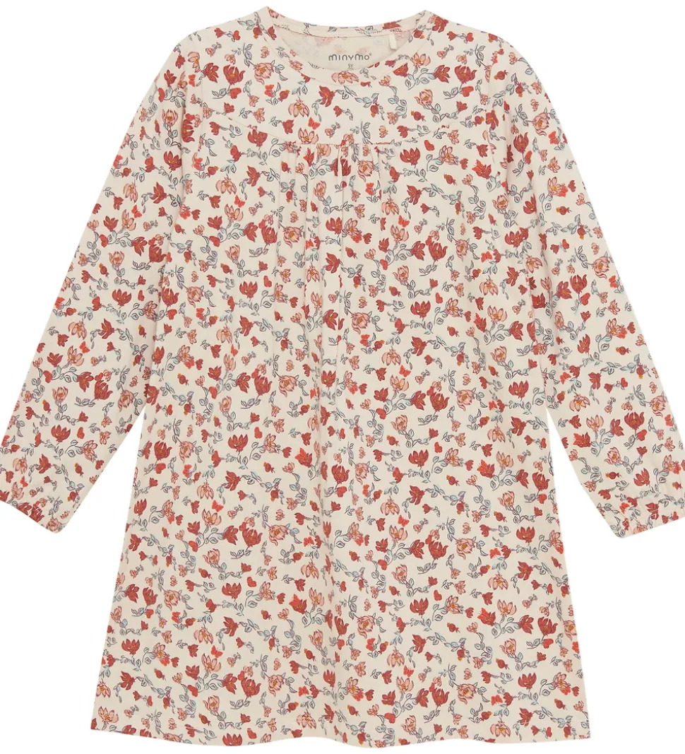 Attraktiv Minymo natkjole med et indbydende design i beige, dekoreret med et blomstret mønster i røde og blå nuancer. Natkjolen har lange ærmer og en rund halsudskæring. Tilføjelsen af elastiske kanter ved håndleddene sikrer en passende pasform.
