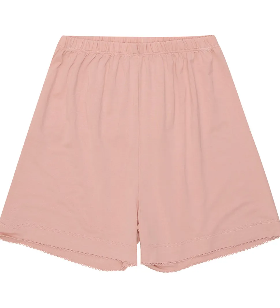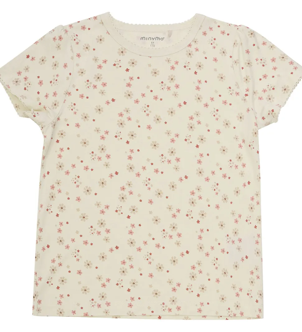Minymo t-shirten har kort ærmer og en rund halsåbning med en smal blondekat. Shortsene har en smal elastikkant i taljen, så de bliver siddende som de skal og en fin blondekant i slutningen. Nattøjet er lavet i en blød kvalitet.