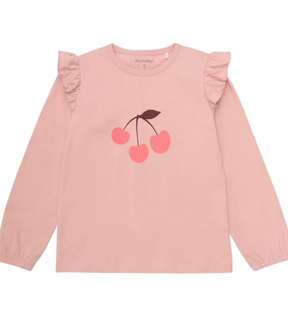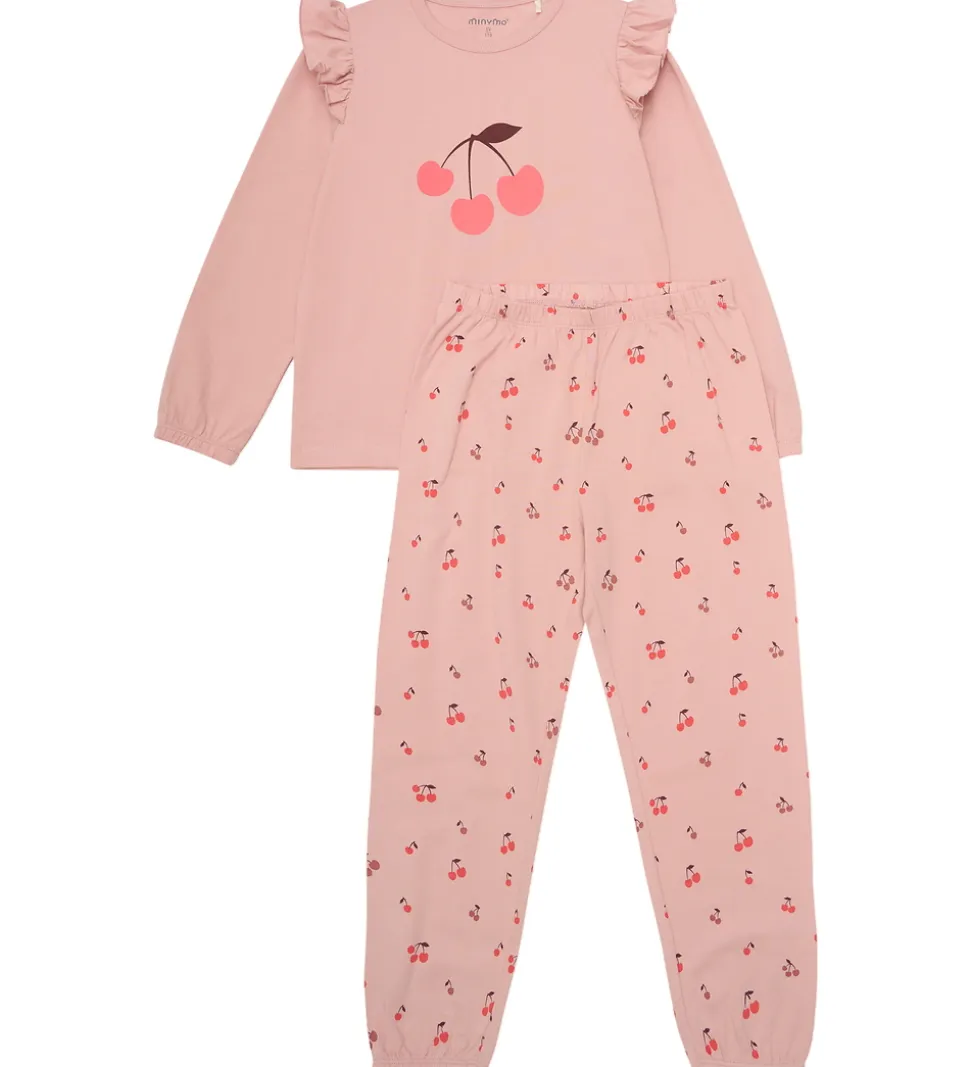 Dejligt Minymo nattøj i en blød rosa farve. Minymo sættet har en langærmet bluse med et charmerende kirsebærprint på fronten og matchende bukser med et all-over kirsebærmønster.