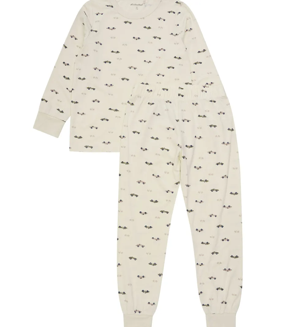 Minymo natblusen har lange ærmer og brede ribkanter. Natbukserne har lange ben med brede ribkanter, og i livet har de en bred elastikkant, som sikrer en god pasform. Nattøjet er lavet i en blød og lækker kvalitet.