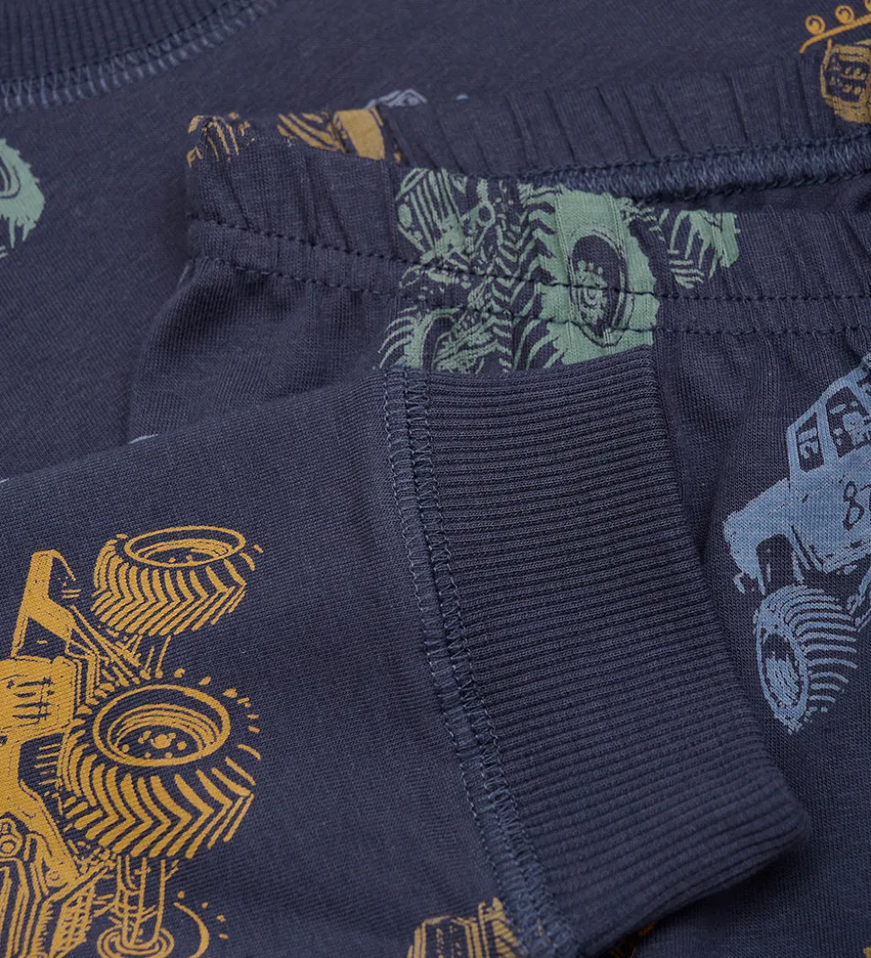 Flot Minymo nattøj 2-delt i en mørk blå nuance med et farverigt monstertruck-print. Minymo blusen har lange ærmer, der sammen med bukserne giver en behagelig pasform.