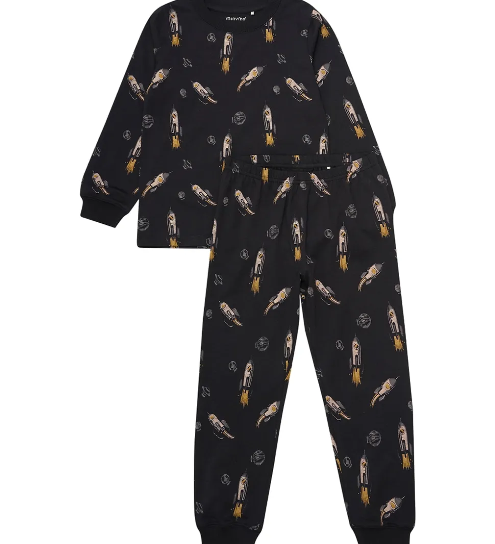 Dejligt Minymo nattøj 2-delt sæt i sort med et fantasifuldt rumskibsprint over det hele. Minymo blusen har lange ærmer, mens bukserne har en komfortabel pasform, begge med elastiske kanter.