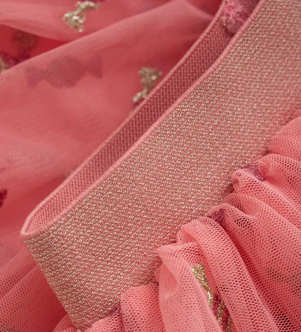 Charmerende Minymo nederdel i en flot pink nuance med et allover glimmerprint af slik. Nederdelen har en elastisk talje, der sikrer en fleksibel pasform.