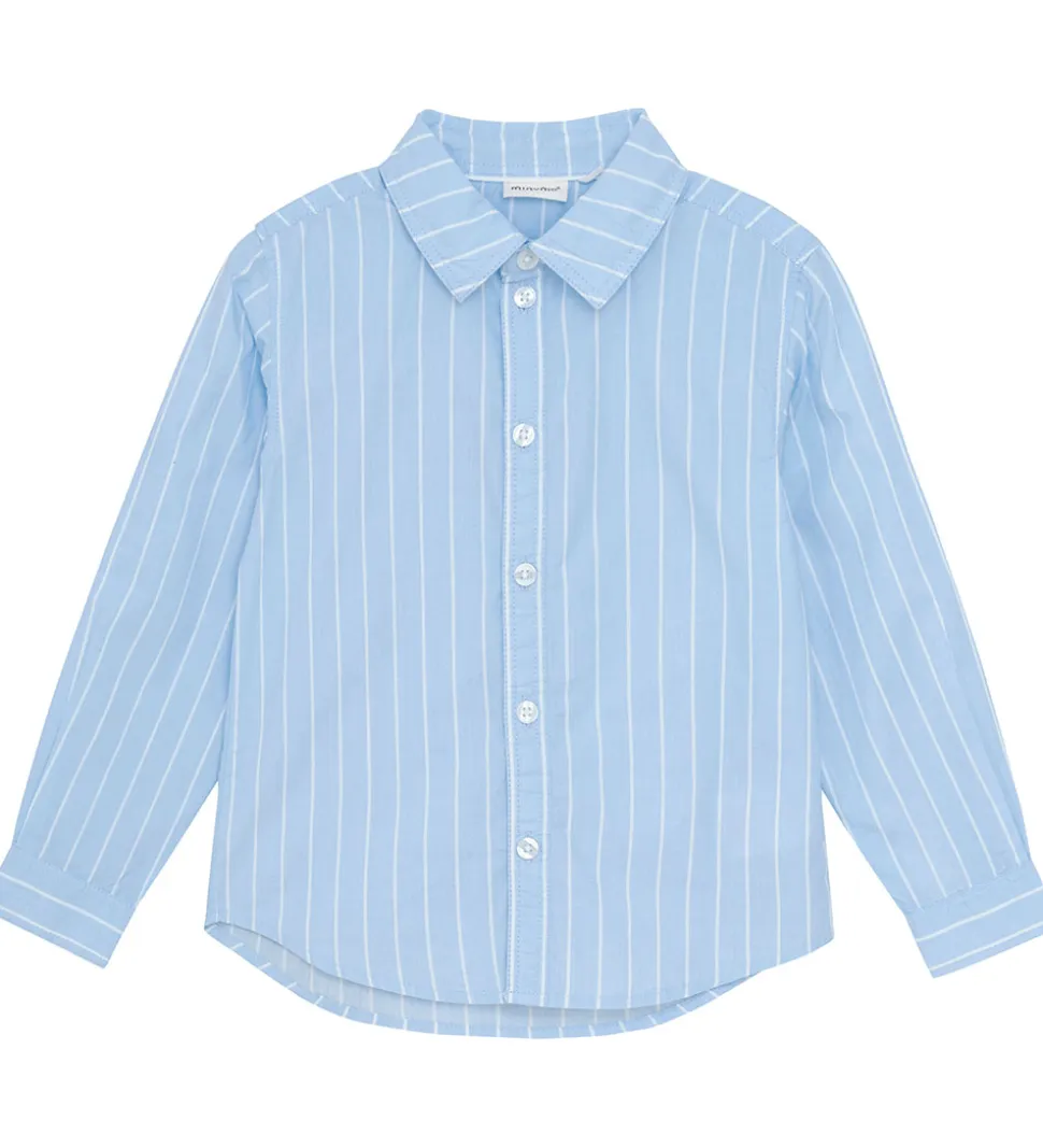 Stilfuld Minymo skjorte i lyseblå med smalle, hvide striber. Skjorten har en klassisk krave og en gennemgående knaplukning fortil. Den har lange ærmer med manchetknapper ved håndleddene, og nederst er der en flot runding.