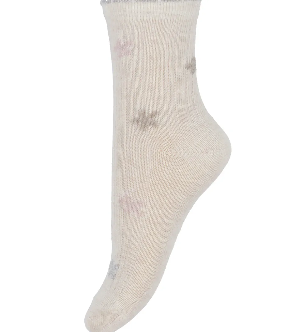 Søde Minymo strømper solgt i en 5-pak i fem forskellige designs i meleret lys beige med detaljer i brun, rosa og sølv med glimmer.