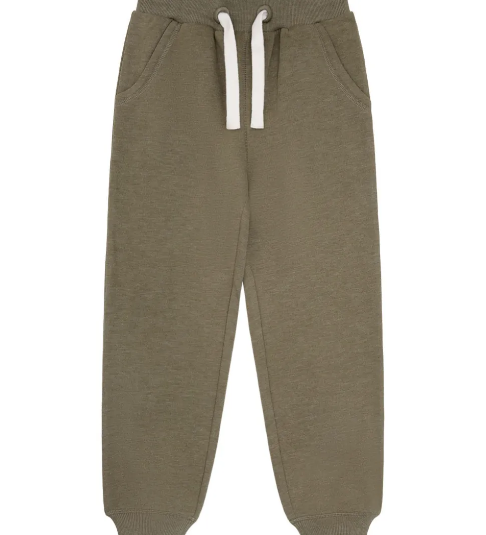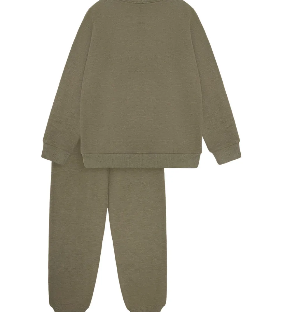 Funktionelt Minymo sweatsæt i en støvet grøn farve, som består af en sweatshirt og et par sweatpants, som begge har blødt børstet bomuld på indersiden. Minymo sweatshirten har lange ærmer og en rund halsudskæring, hvilket gør den praktisk og let at tage på. Sweatpantsene har en komfortabel elastikkant i taljen med hvide justerbare bindebånd fortil, hvilket sikrer en god pasform. Underdelen afsluttes med ribkanter ved anklerne.