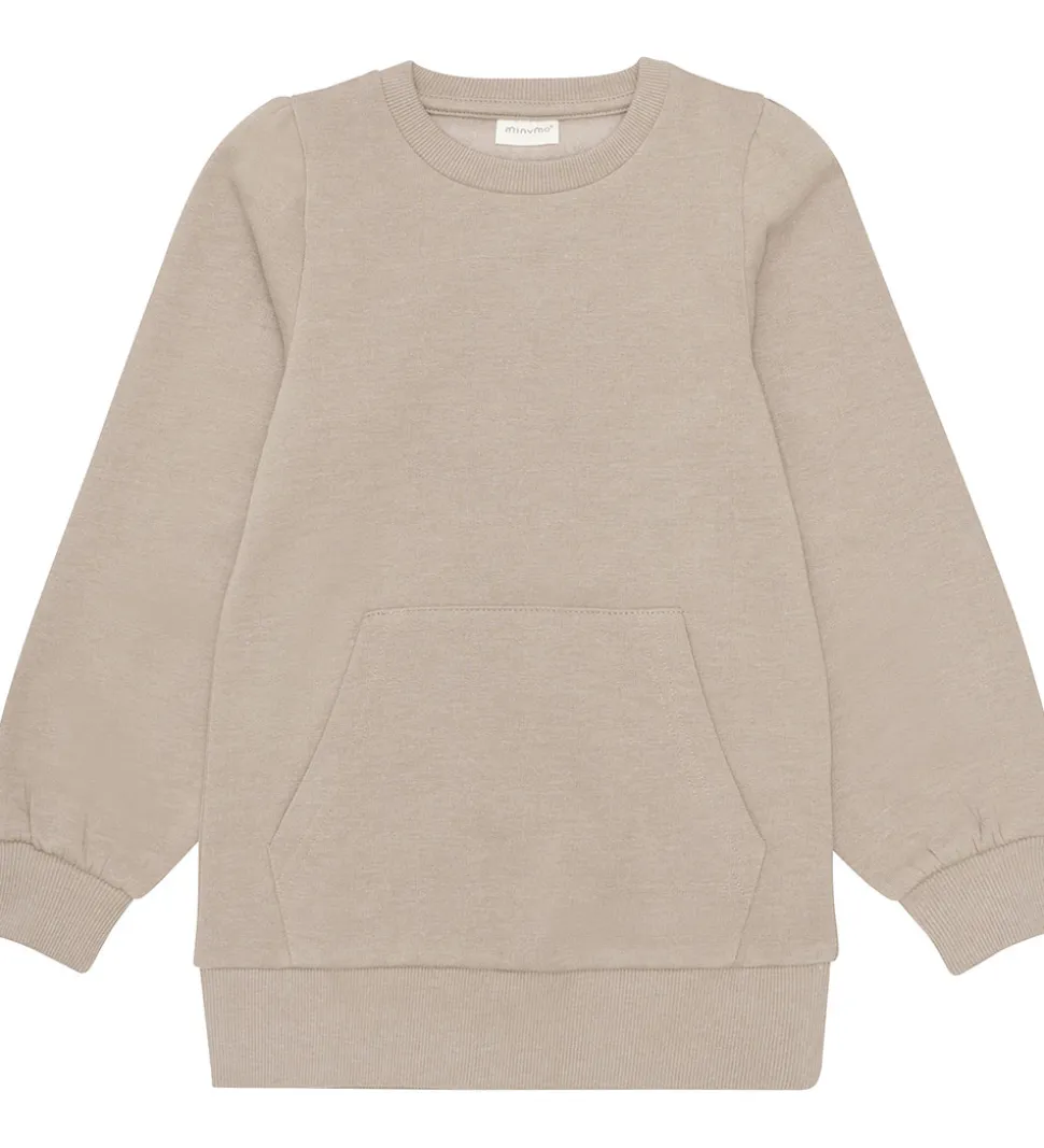 Attraktive Minymo sweatshirts solgt i en 2-pak i en flot beige og en mild lilla nuance. Minymo sweatshirtsene har en klassisk rund halsudskæring og lange ærmer med søde pufskuldre. Begge sweatshirts har en praktisk kængurulomme på maven, som tilføjer et funktionelt designelement. Ribkanter ved håndled og i bunden sikrer en god pasform.