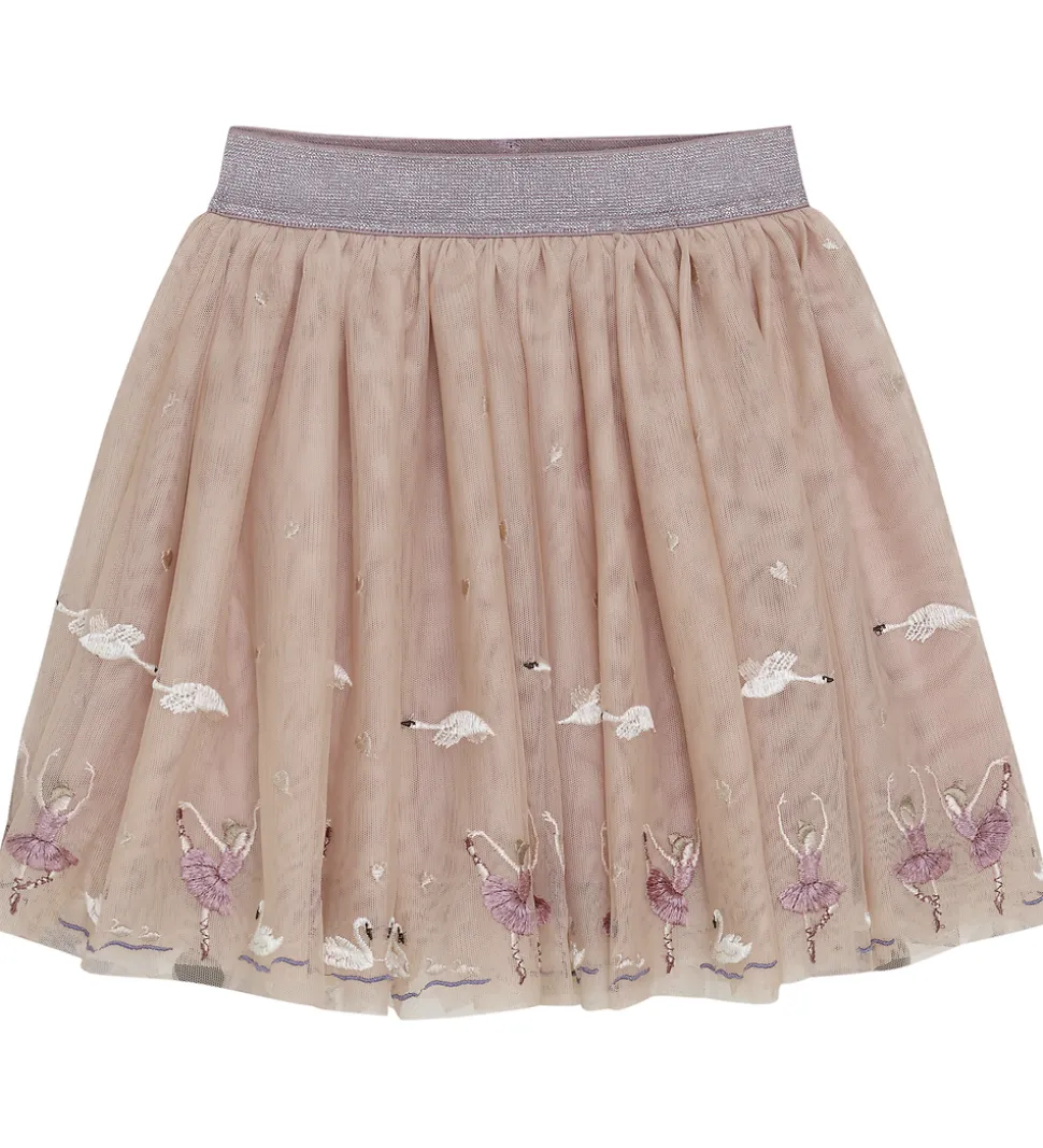 Fin tylnederdel fra Minymo i lys rosa, og langs den nederste kant er der broderet hvide svaner og ballerinaer med rosa strutskørter. I livet har den sølvfarvet med glimmer.