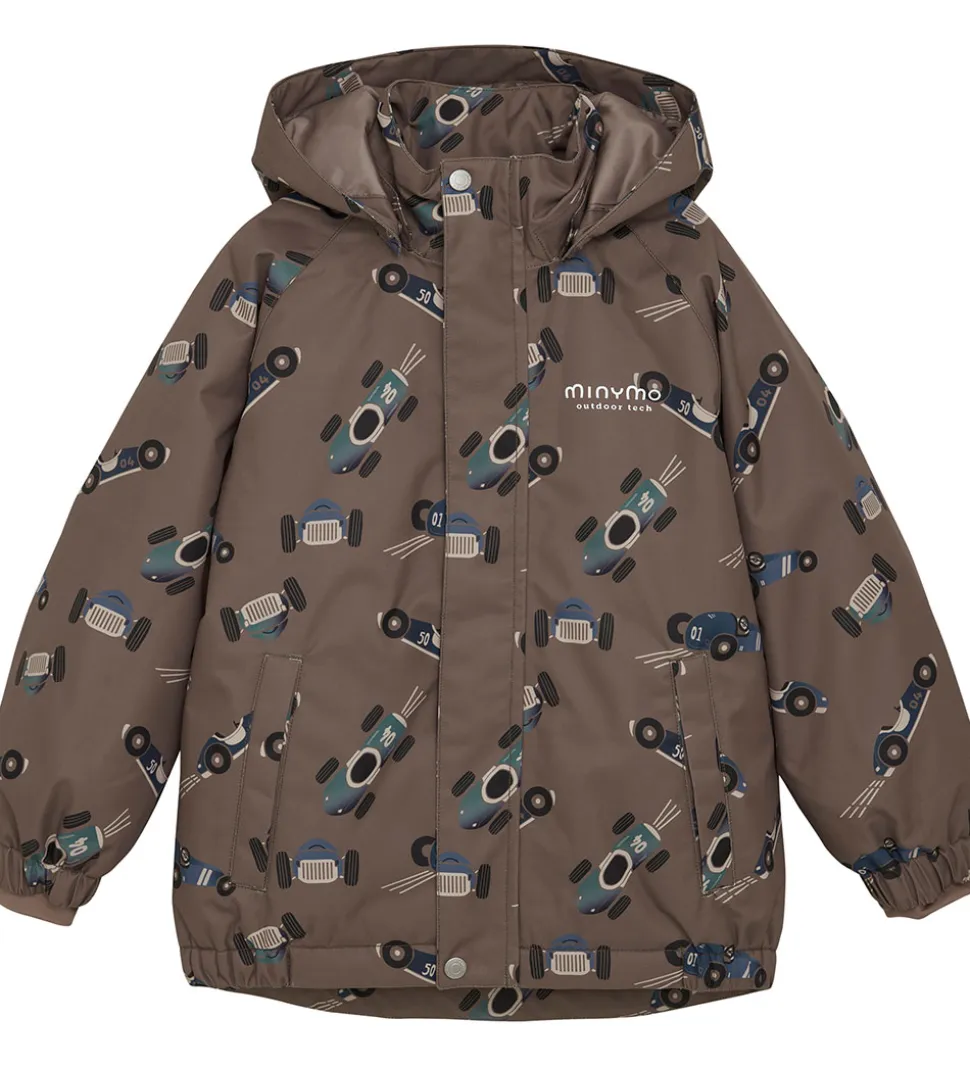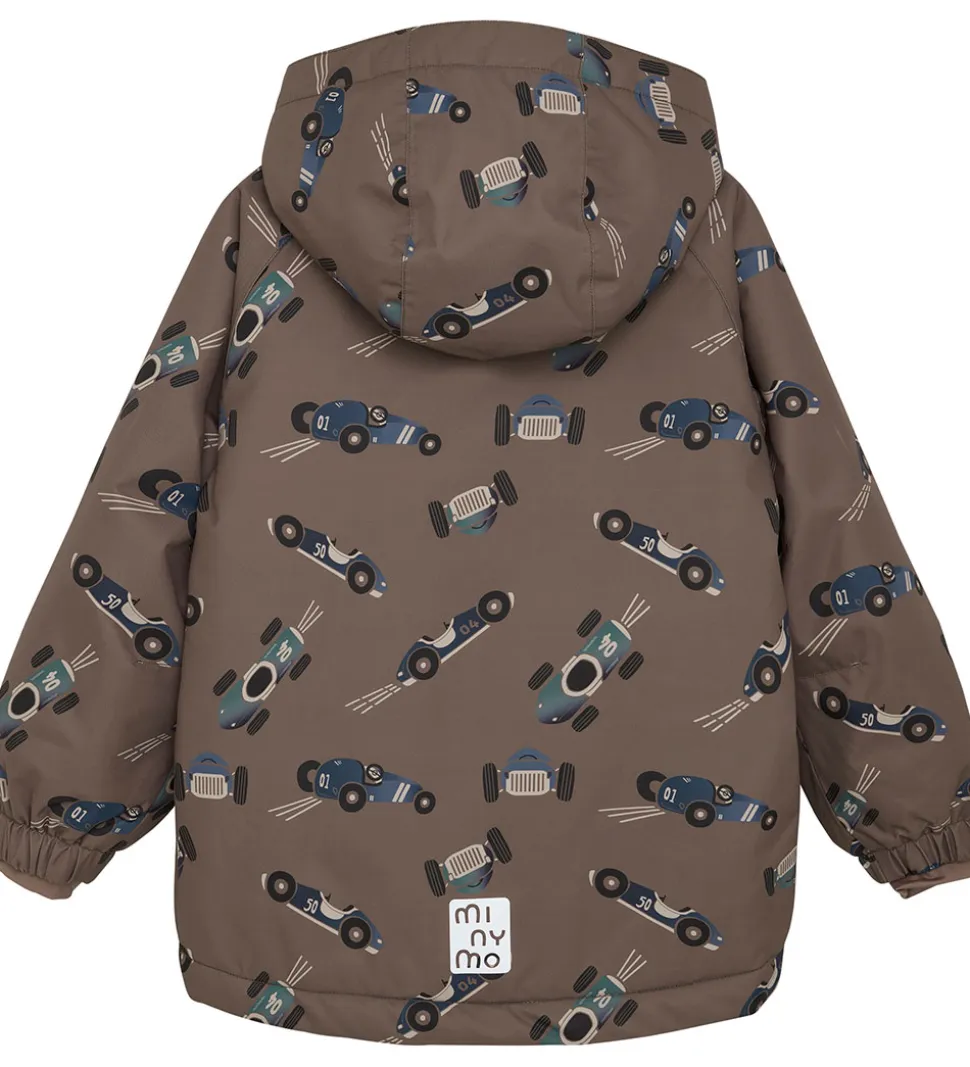 Smart Minymo vinterjakke i brun med et alloverprint af racerbiler i blå og grønne nuancer. Vinterjakken har praktiske refleksdetaljer.