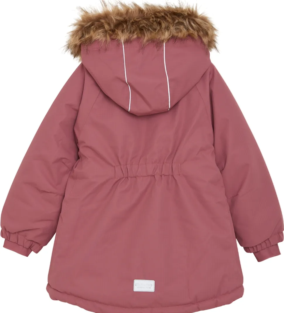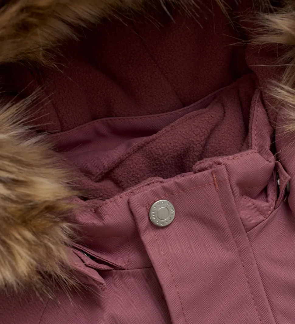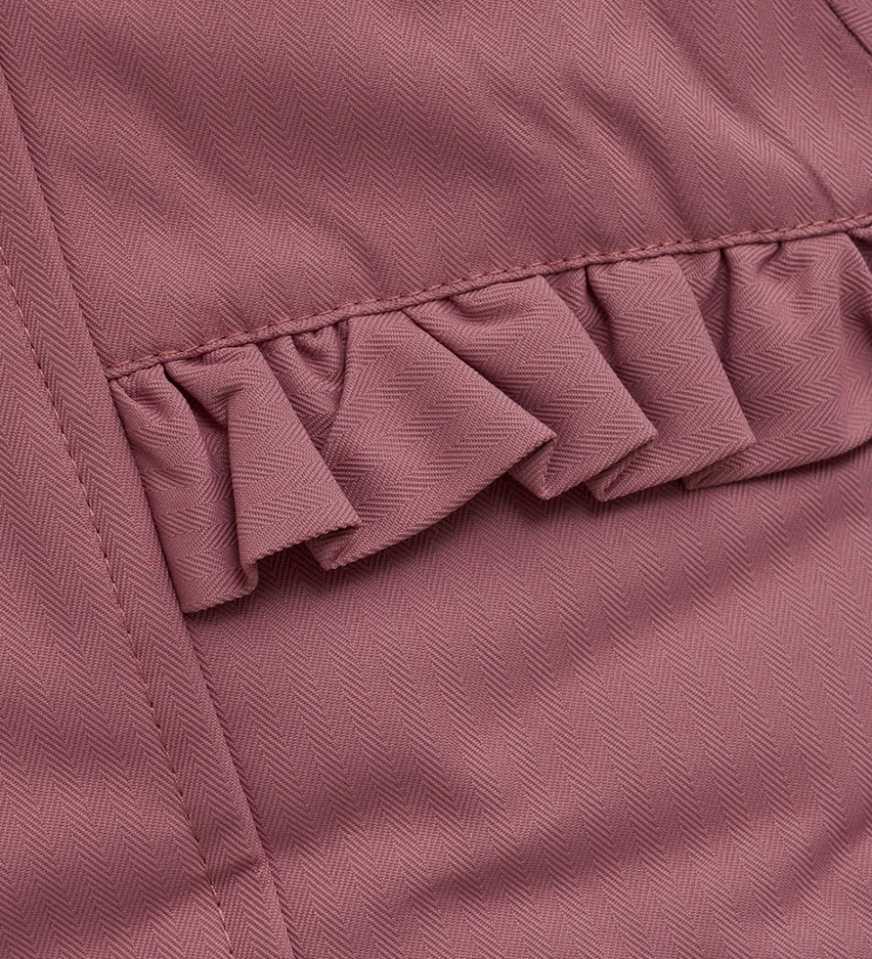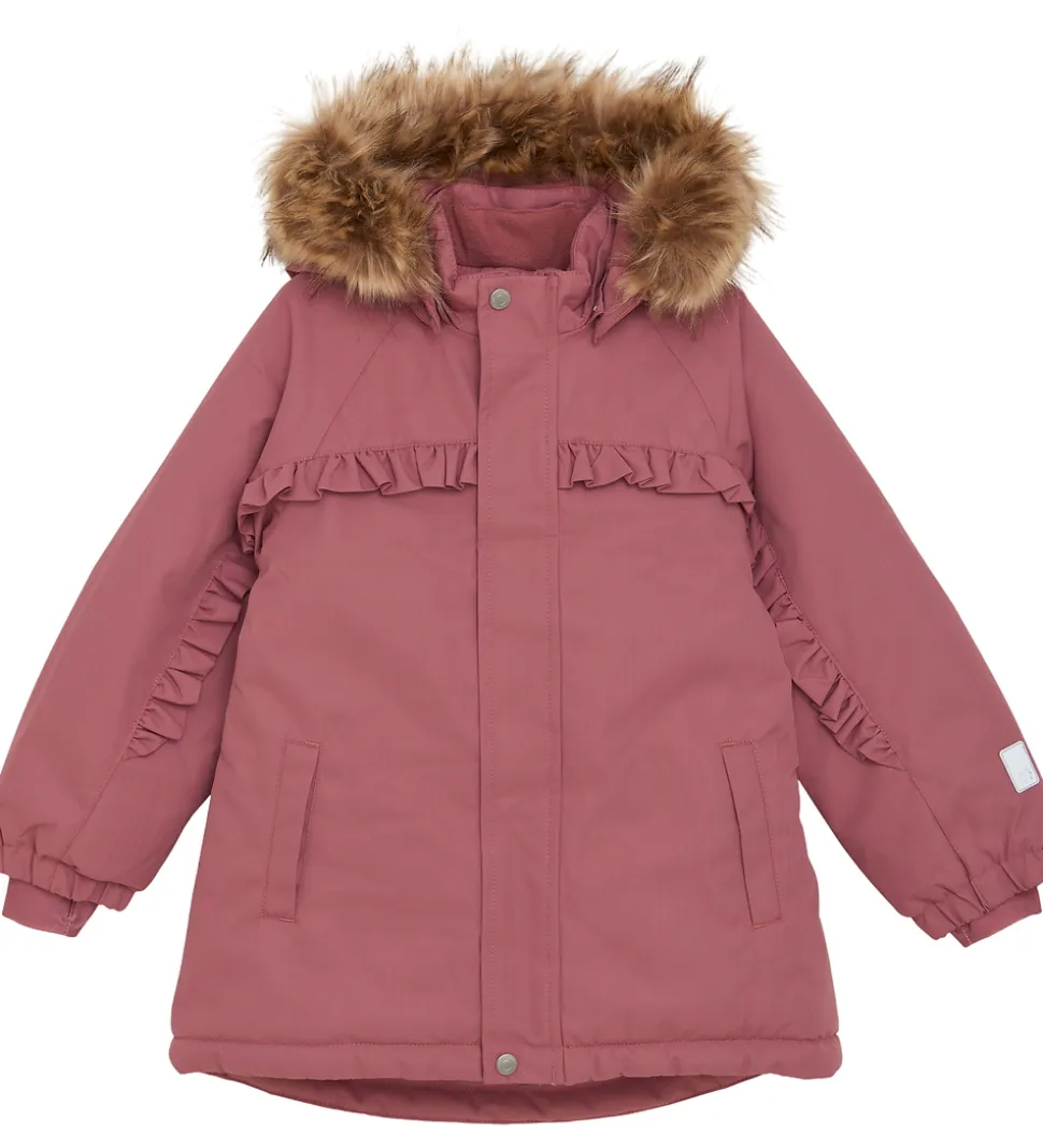 Fin Minymo vinterjakke i mørk rosa med flotte flæser fra brystet og ud på armene. Vinterjakken er også med smarte refleksdetaljer.