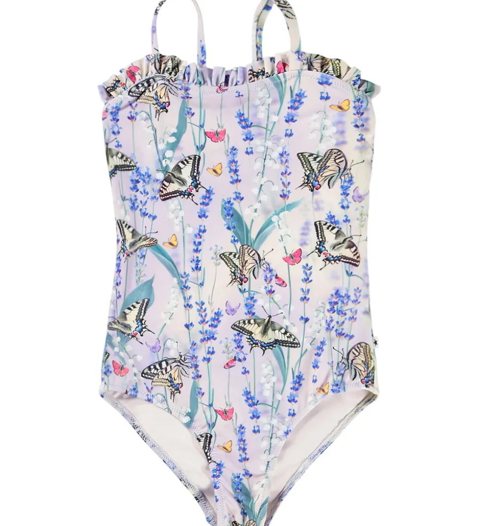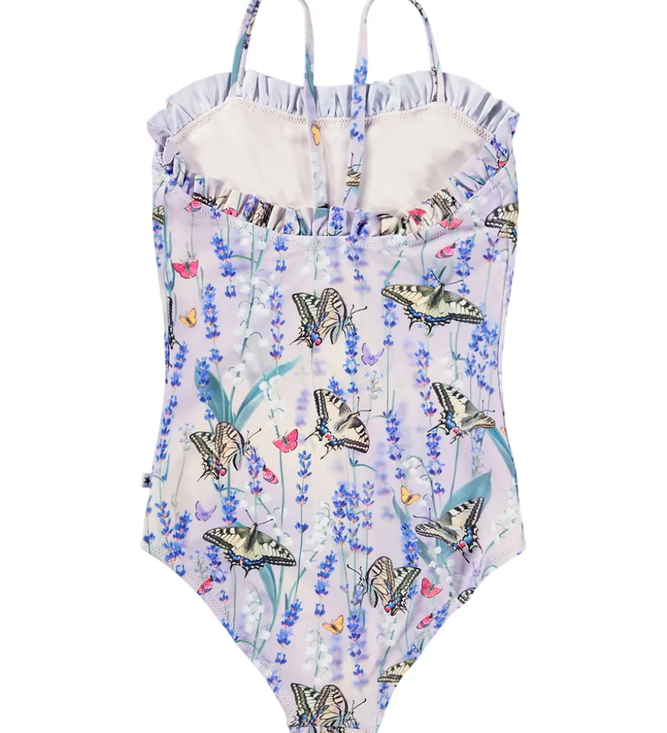 Fin Molo badedragt i lyse lilla nuancer med et charmerende mønster af sommerfugle og blomster i flotte farver. Den har en flæsekant langs brystet, der tilføjer et elegant præg. Molo badedragten har smalle skulderstropper og elastikkant i alle åbninger, som sikrer en god pasform, så badedragten sidder som den skal.
