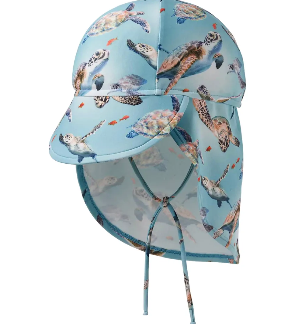 Flot badehat fra Molo i lyseblå med print af havskildpadder og små fisk.