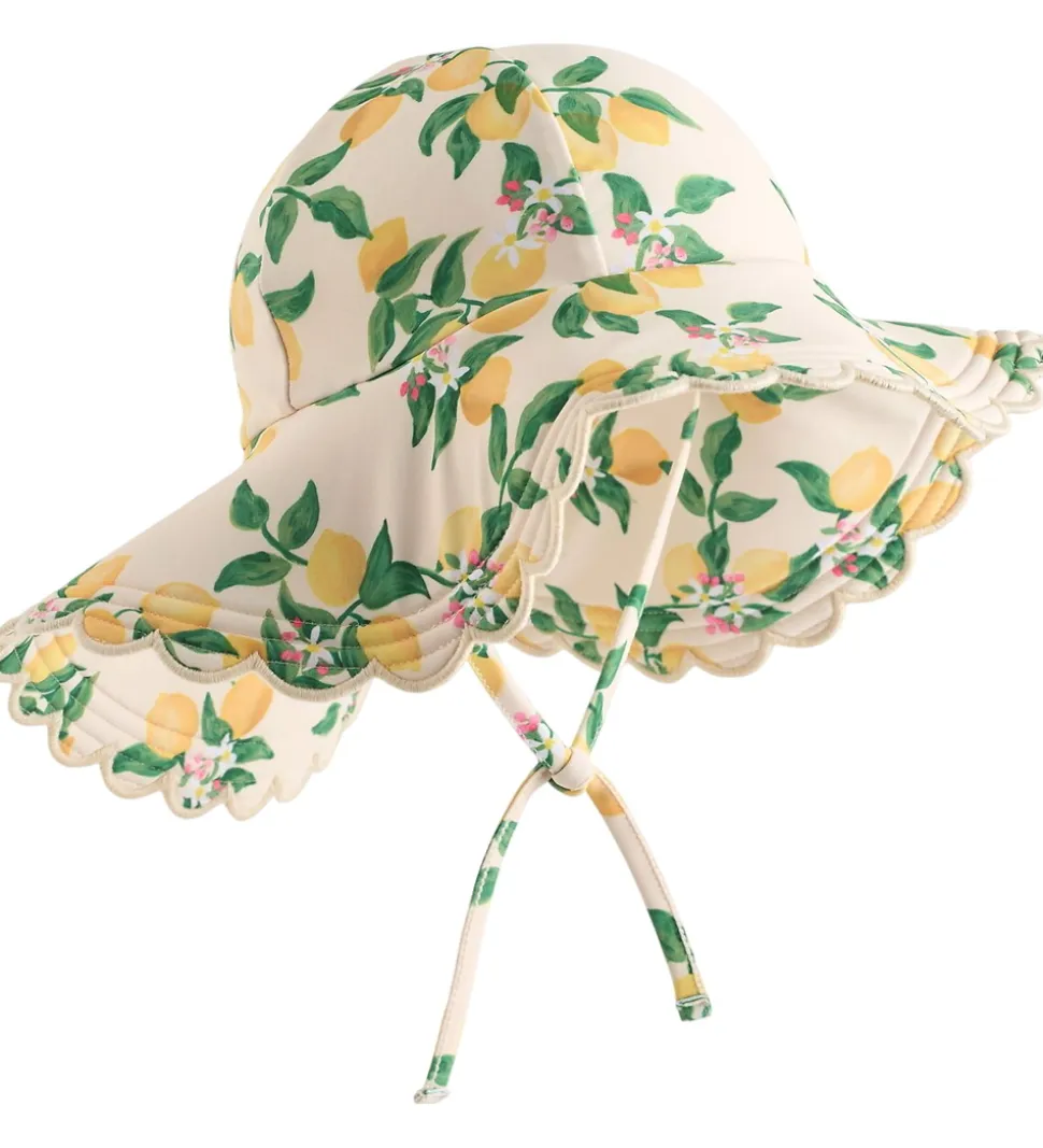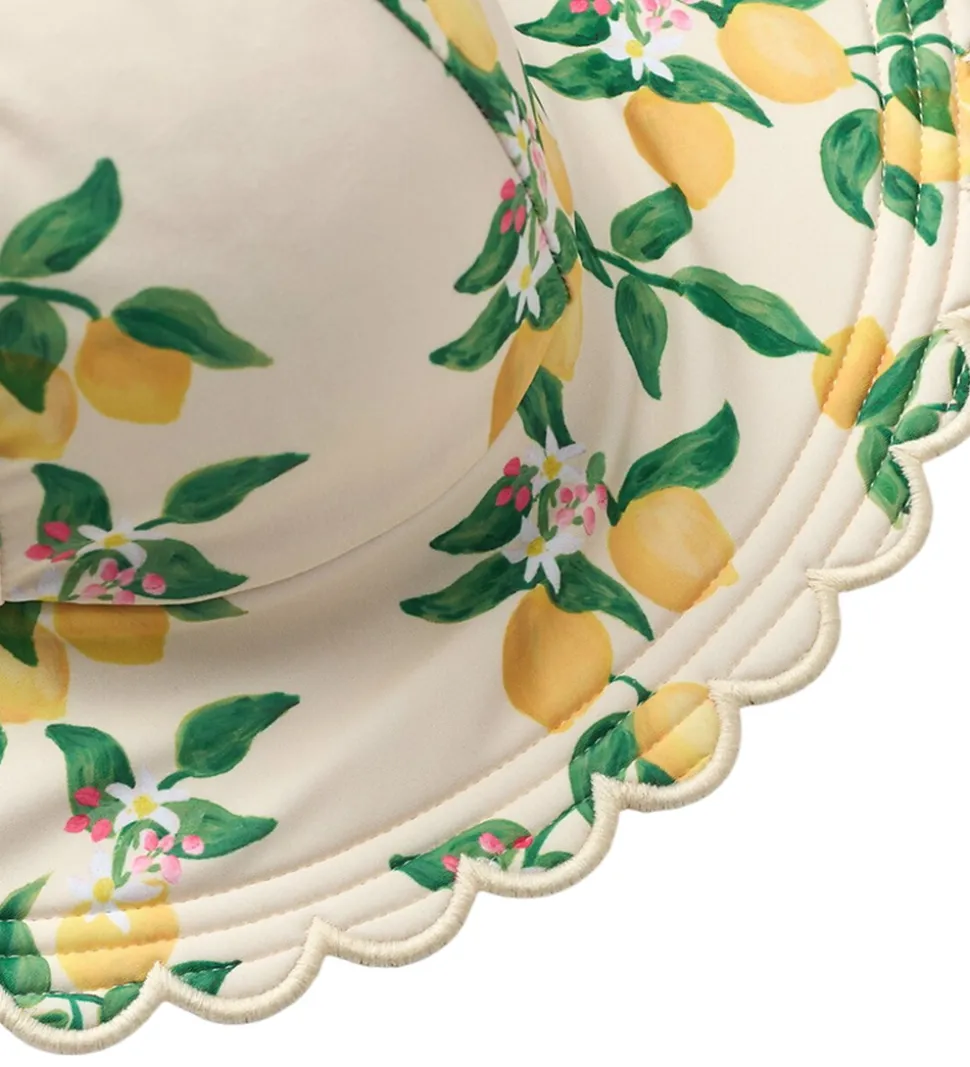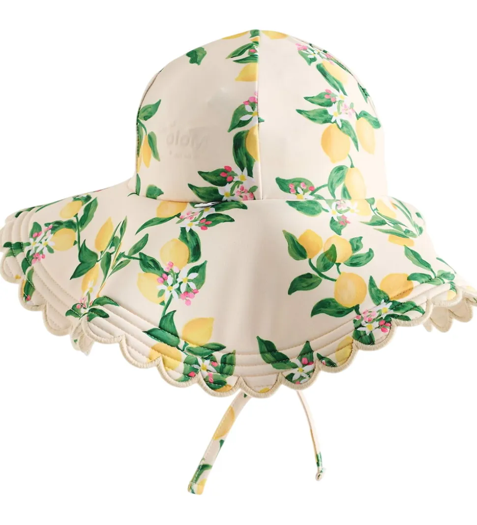 Smuk Molo badehat i lys beige med et charmerende citronmønster. Badehatten har en bred skygge med en bølgende kant, der giver et flot look. Molo badehatten er udstyret med bindebånd, som bindes under hagen. Badehatten har et praktisk UV-filter på 50+.