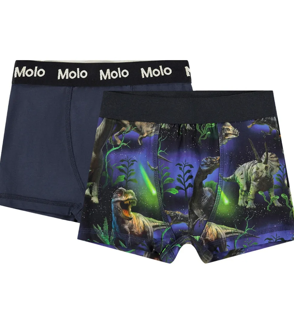 Seje Molo boxershorts i en pakke med to par. Molo boxershortsene har et par i enkel marineblå farve og et par med et iøjnefaldende print af dinosaurer i en naturscene mod en mørk baggrund. Begge par har en elastisk talje, som giver en behagelig pasform.