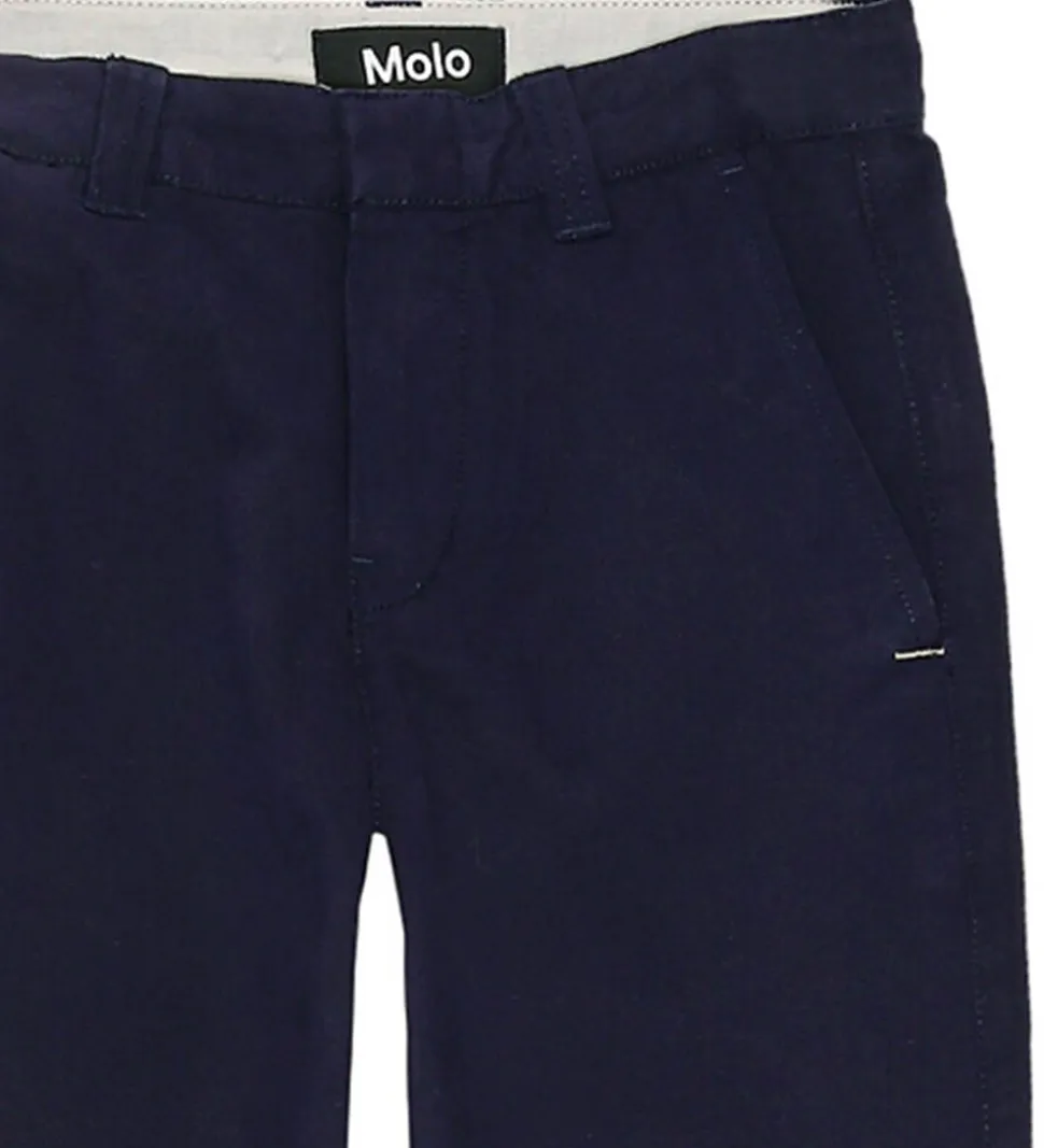 Elegante bukser fra Molo i en dyb marineblå farve. Molo bukserne er designet med en justerbar talje og har praktiske bæltestropper. De er udstyret med skrå, åbne sidelommer, en lille møntlomme og en paspoleret snydelommer bagpå. Bukserne er designet i relaxed fit, som passer perfekt til både hverdag og fest.