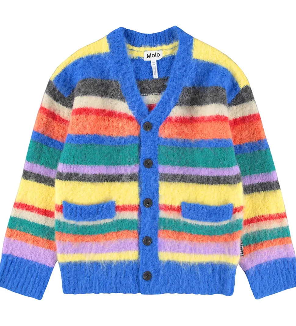 Smuk Molo cardigan i et farverigt stribet design med nuancer af blå, gul, rød, lilla, grøn og sort. Cardiganen har en klassisk v-udskæring og en knaplukning med sorte knapper. Den bløde struktur og de to forlommer giver cardiganen et praktisk og behageligt udtryk. Molo cardiganen er ideel til at tilføje et stilsikkert lag til garderoben.