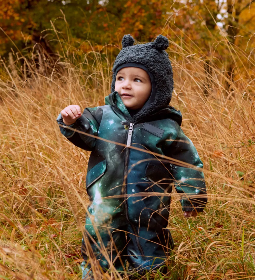 Flot Molo elefanthue i mørkeblå teddyfleece og med et gråmeleret for. Molo elefanthuen består af to lag og har en rund hovedform med små øre-detaljer på toppen.