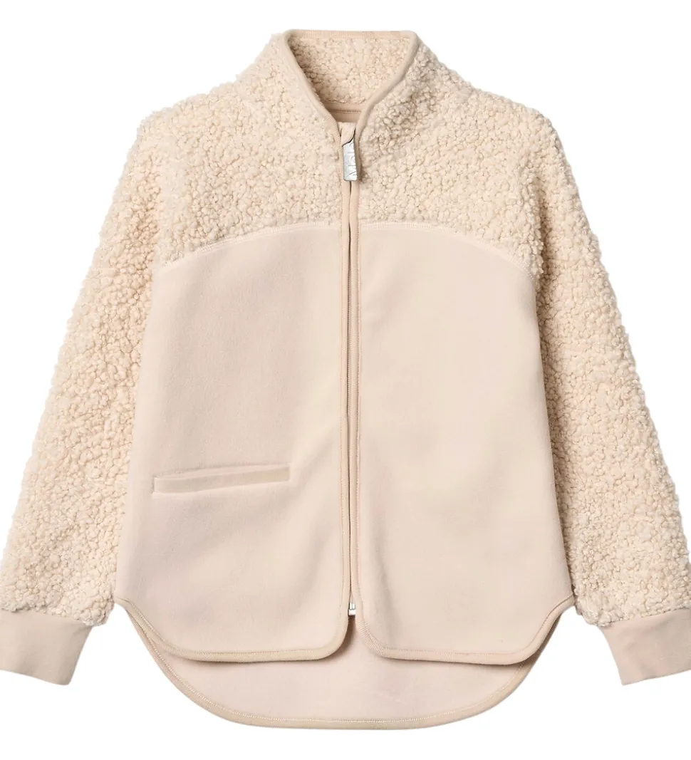 Flot Molo fleecejakke i en lys beige farve med en kontrast mellem glat fleece og blødt teddyfleece på ærmer og skuldre.