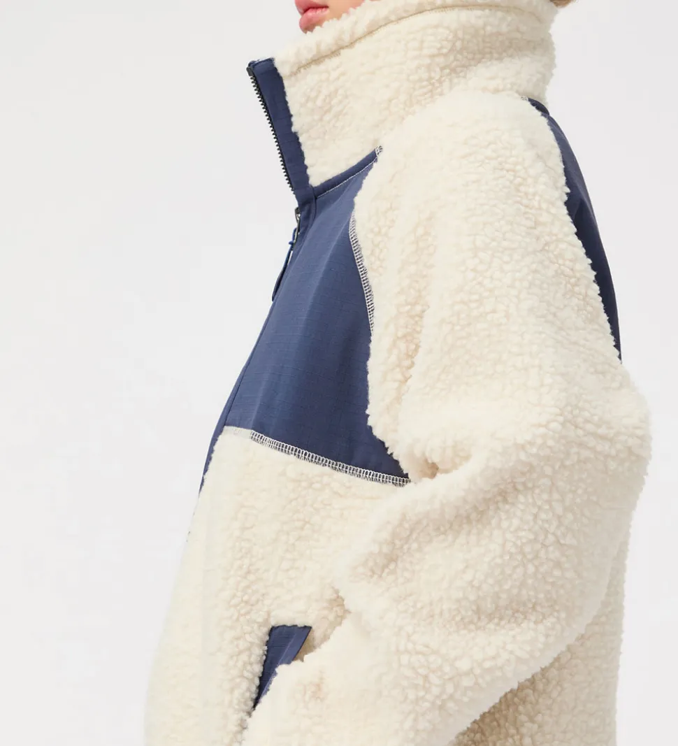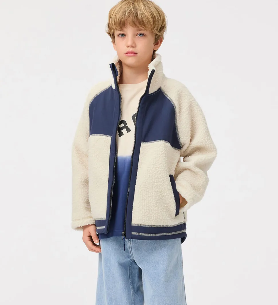 Skøn Molo fleecejakke i en lys beige farve med mørkeblå detaljer. Jakken har lange ærmer og praktiske lommer, hvilket gør den både funktionel og stilfuld. Molo tilbyder kvalitet og komfort i dette design.