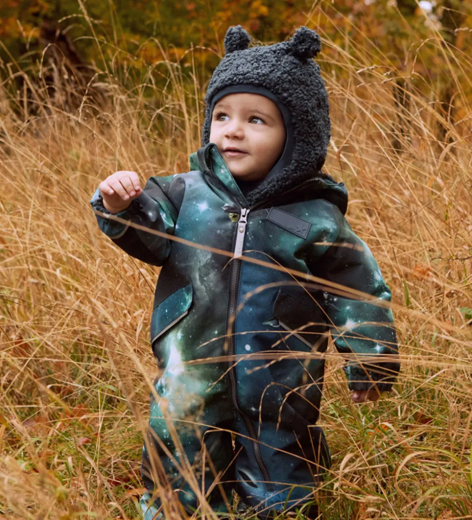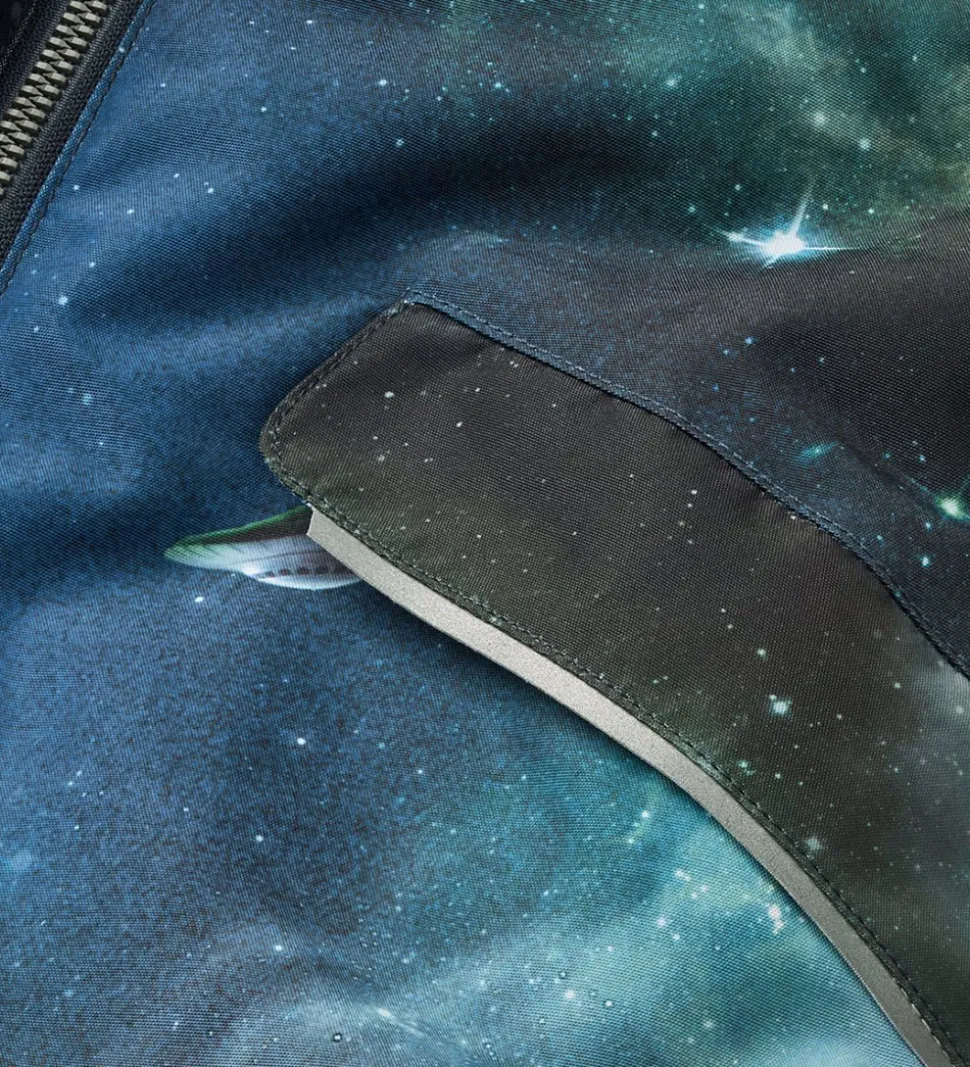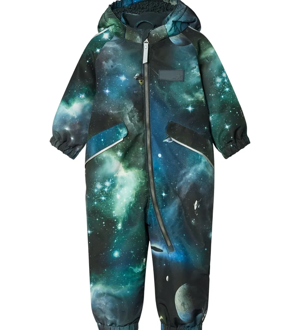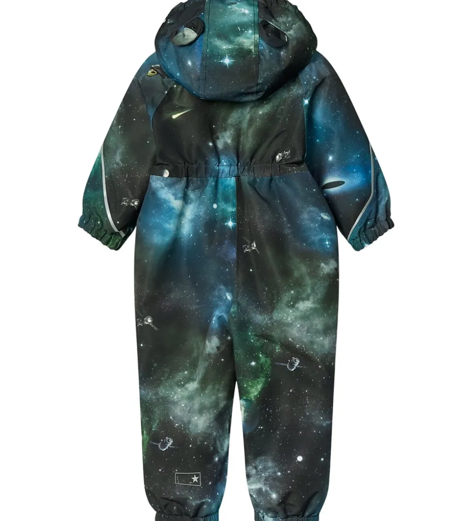 Sød Molo flyverdragt med et fascinerende universprint i blå og grønne nuancer samt med en gummiapplikation på venstre bryst. Flyverdragten har også logoreflekser og reflekspipings samt er der små, fine bamseører på hætten.