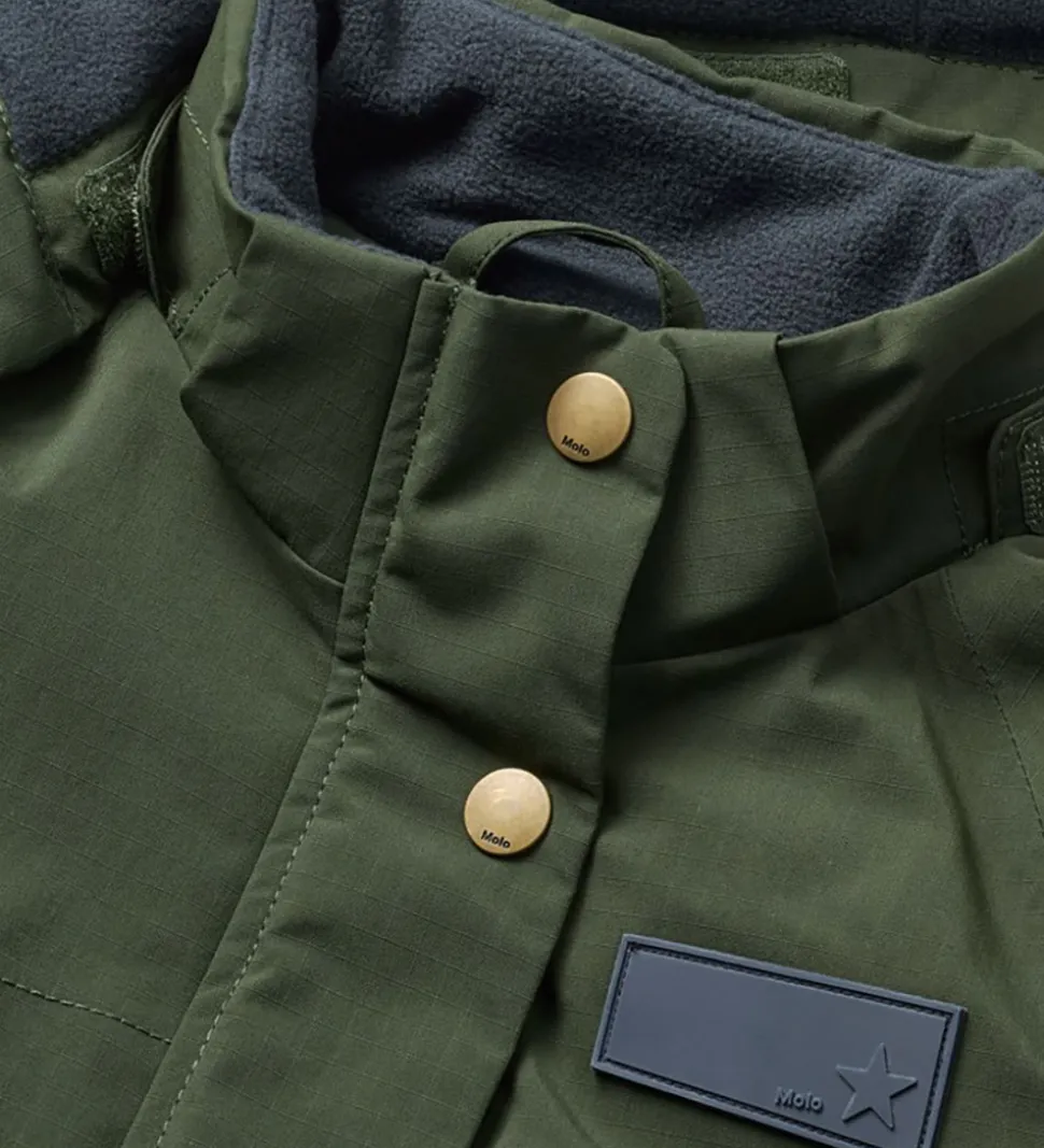 Lækker Molo flyverdragt i ensfarvet mørkegrøn med en gummiapplikation på venstre bryst. Flyverdragten er udstyret med store stjernereflekser og reflekspipings.