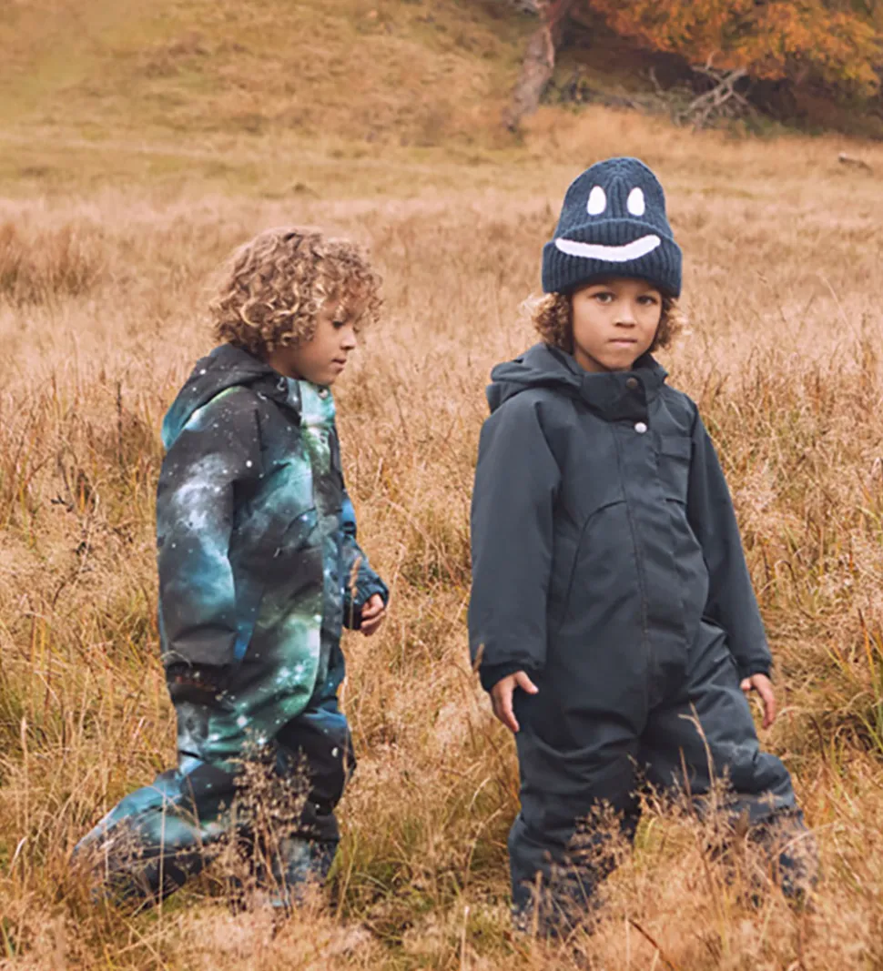 Lækker Molo flyverdragt med et fascinerende universprint i blå og grønne nuancer samt med en gummiapplikation på venstre bryst. Flyverdragten er udstyret med store stjernereflekser og reflekspipings.