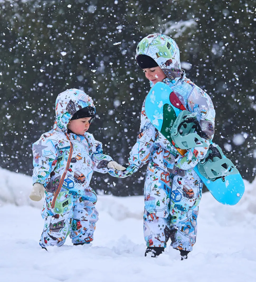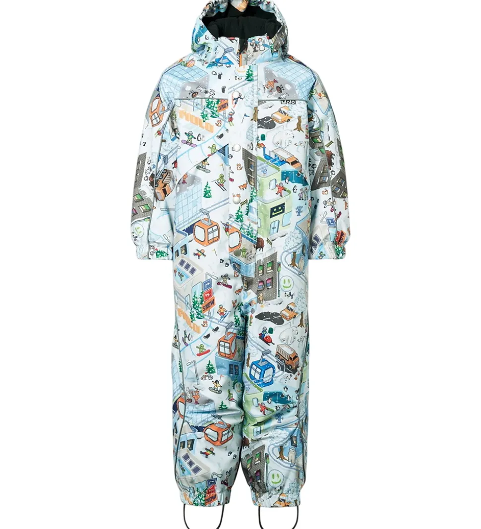 Smart Molo flyverdragt med et alloverprint af pixeleret vinterlandskab. Flyverdragten er udstyret med store stjernereflekser og reflekspipings.