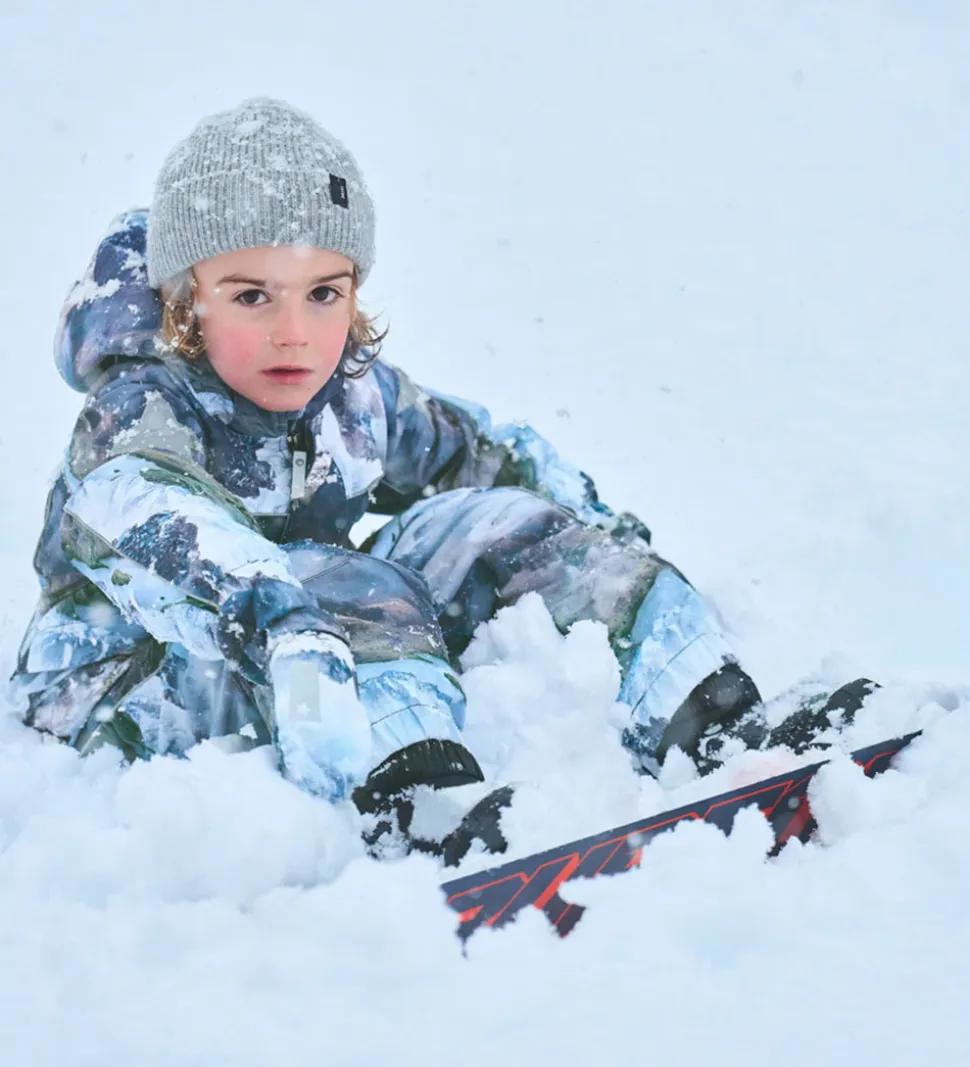 Smart Molo flyverdragt med et lyst alloverprint af et sneklædt bjerglandskab. Flyverdragten er udstyret med store stjernereflekser og reflekspipings.