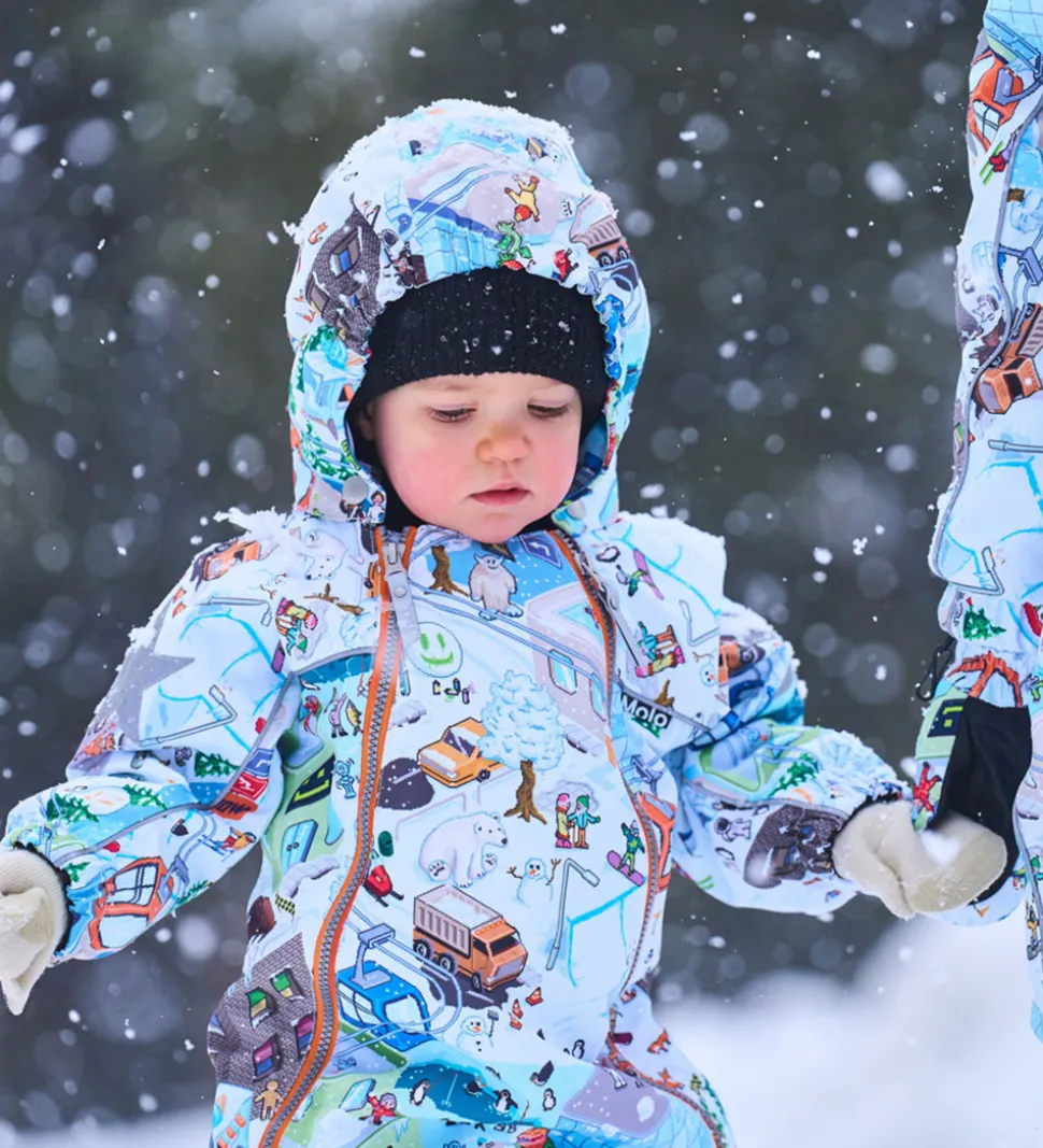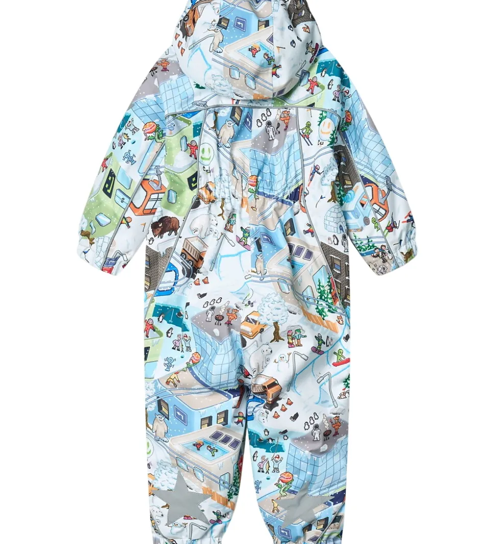 Flot Molo flyverdragt med et alloverprint af pixeleret vinterlandskab. Flyverdragten er udstyret med store stjernereflekser og reflekspipings.