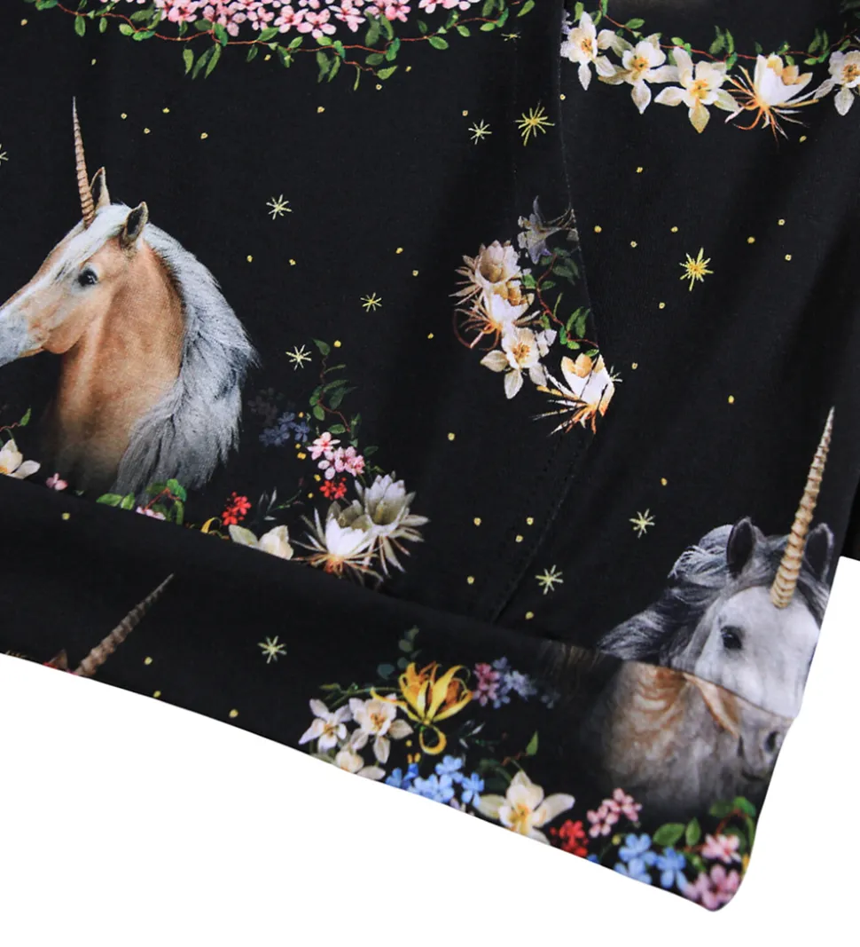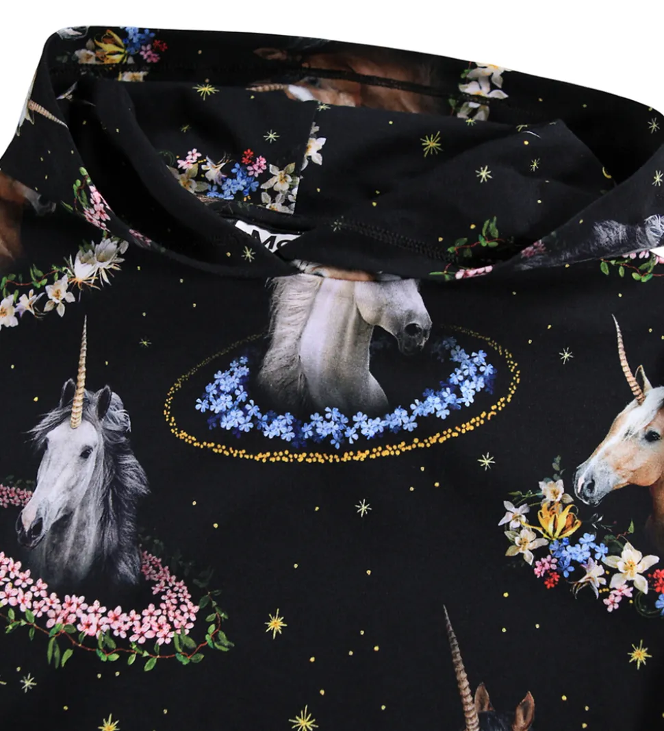 Charmerende Molo hættetrøje med et eventyrligt print af enhjørninger omringet af blomsterkranse på en sort baggrund. Hættetrøjen har en praktisk kængurulomme foran og er i en glat og let bomuldskvalitet.