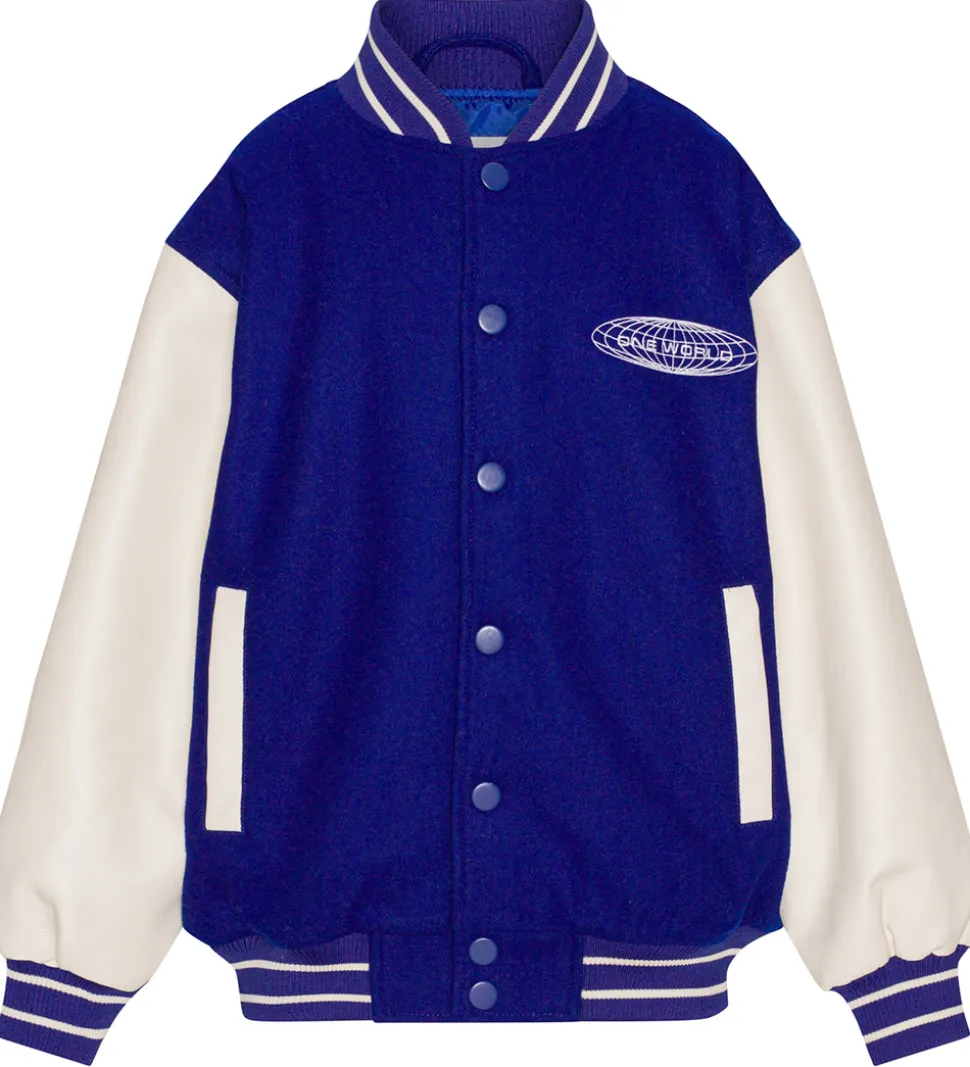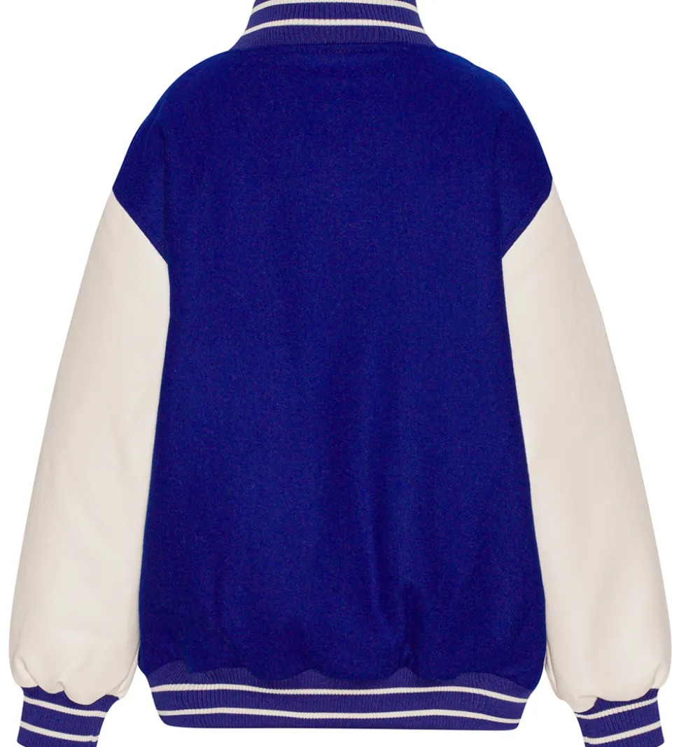 Sej Molo jakke i blå med et broderet cirkelprint på venstre bryst samt med hvide ærmer i imiteret læder.