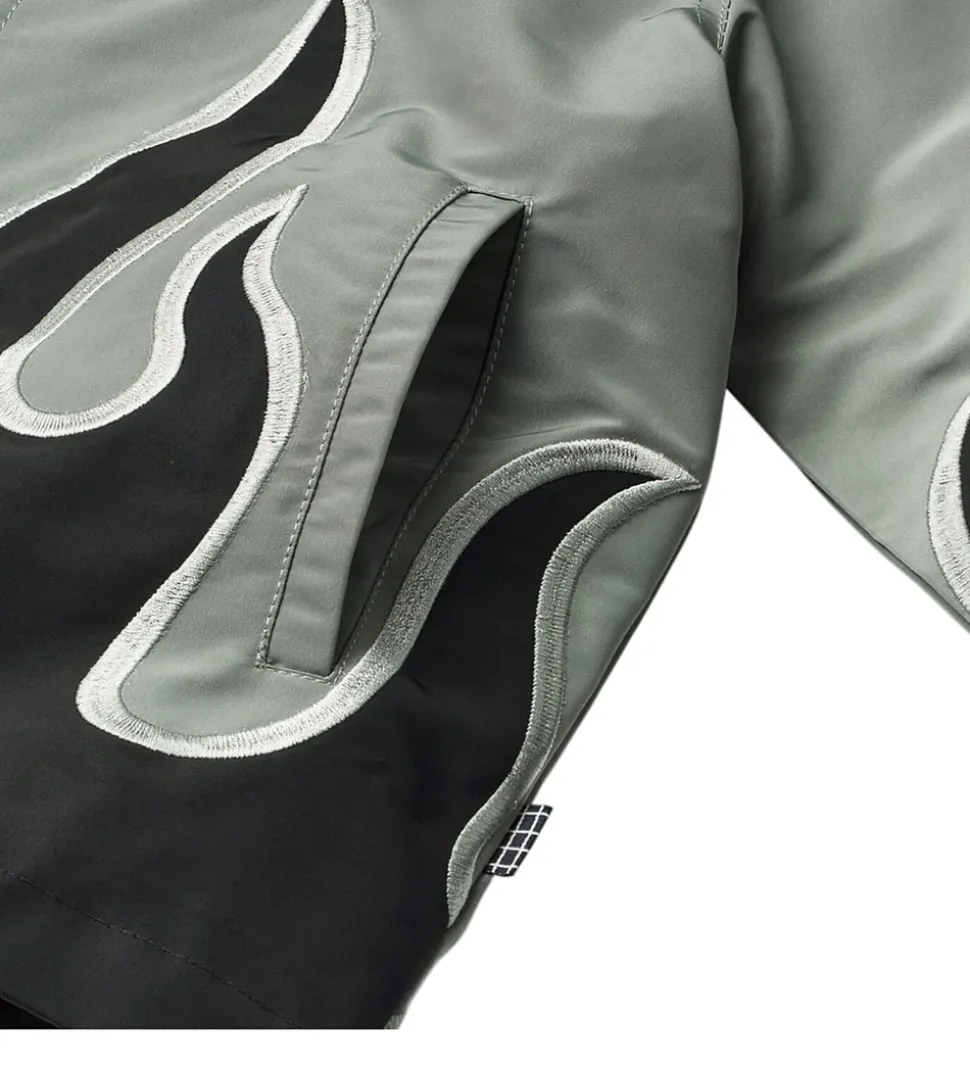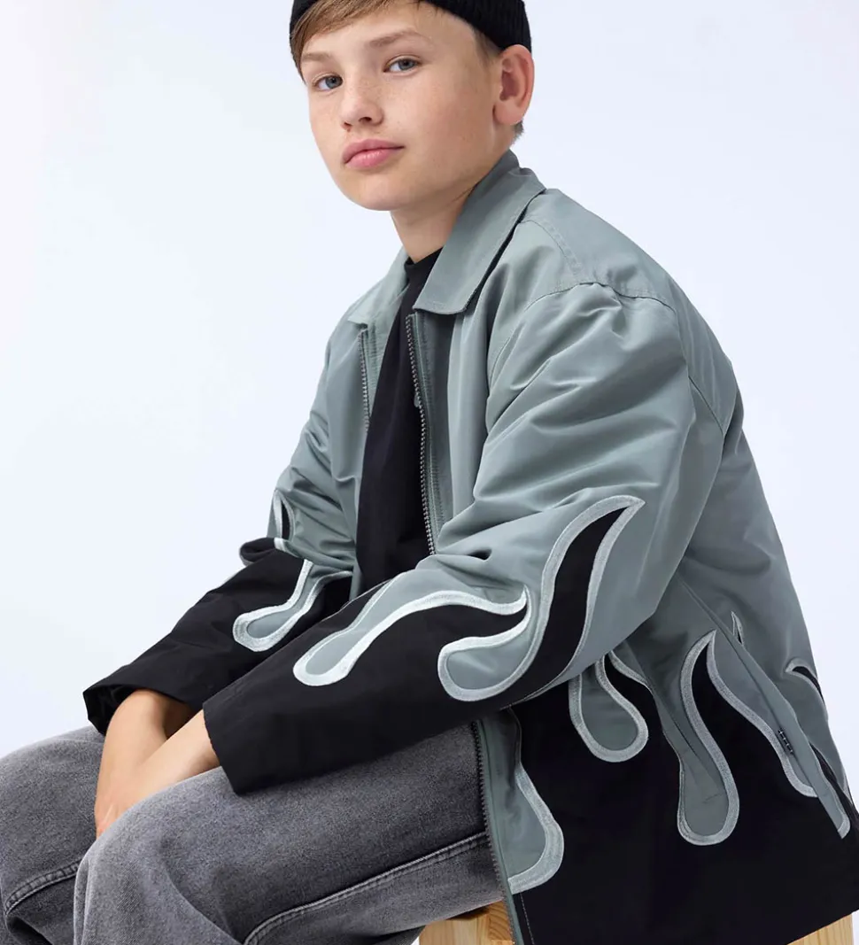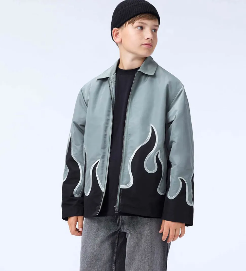 Flot Molo jakke i støvet grøn med print af flammer nederst i sort med sølv kanter. Jakken har en krave og lukkes med lynlås fortil. Den har lange ærmer og lommer fortil med fint fleecefor indvendigt. Jakken har en let polyestervattering, som gør den god til overgangsmånederne.