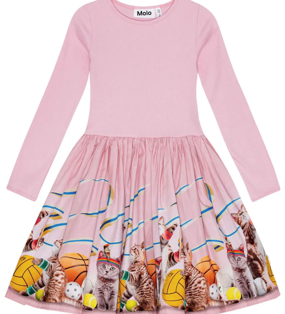 Charmerende Molo kjole i lyserød farve med lange ærmer. Molo kjolen har et unikt print med katte og farverige bolde på nederdelen. Toppen er ensfarvet med fin ribstruktur, hvilket giver en fin kontrast til det detaljerede skørt.